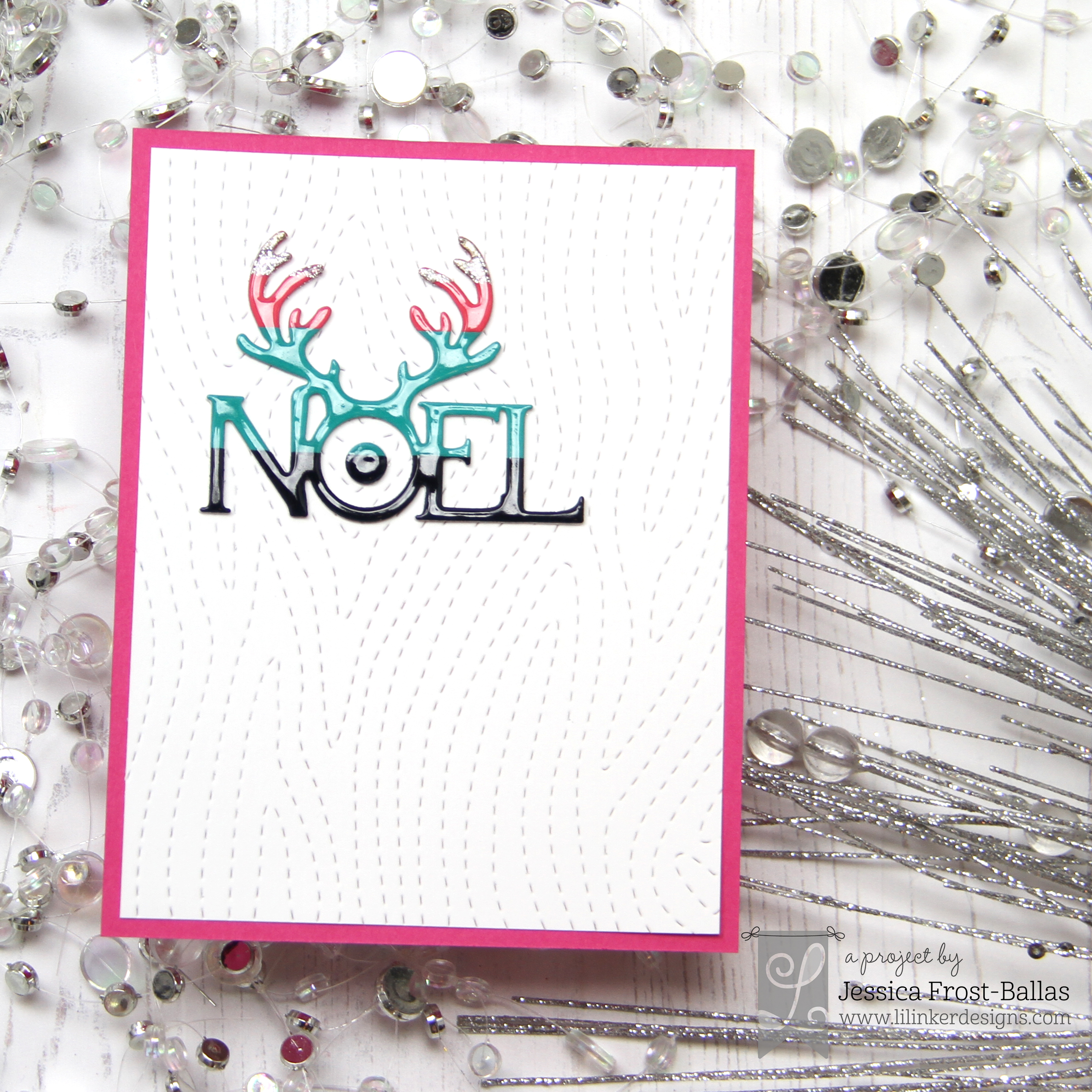 I also wanted a fun non-traditional color palette for this card so I decided to use pink, teal, and navy! I die-cut the Stitched Woodgrain cover-up die from white cardstock, trimmed it down to 4″ by 5.25″, and adhered it to a pink card base. Next I adhered a strip of pink, teal, and navy cardstock to a piece of white copy paper and ran the Noel word die through my Big Shot. I swiped the edge of the antlers with versamark and heat-embossed them with gold tinsel embossing powder. Finally I adhered the sentiment to the card panel and covered it with a layer of nuvo crystal glaze for a little shine and dimension!