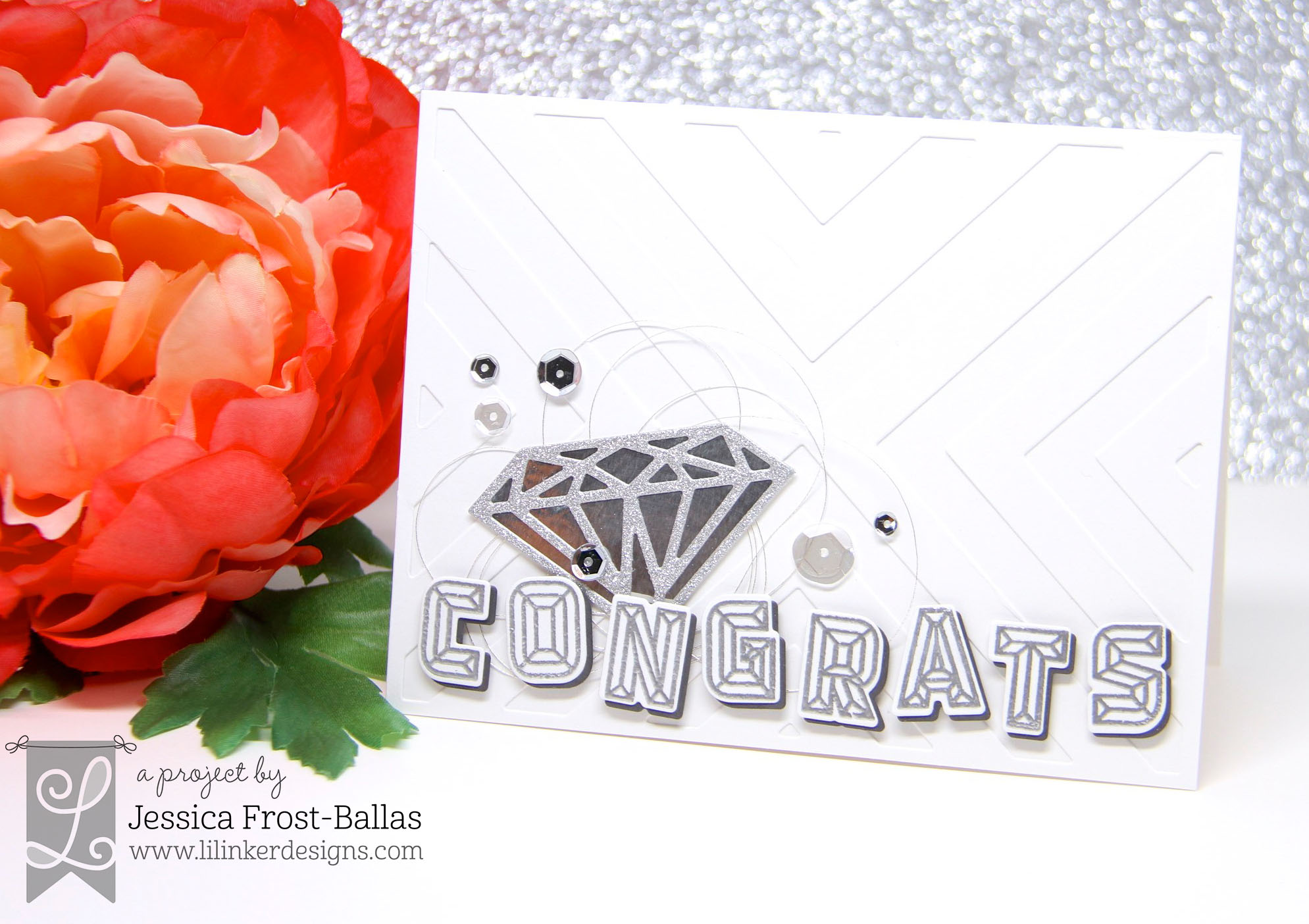 I also die-cut the same letters from a dark grey cardstock to create a shadow effect for each letter. Then I adhered the diamond over a tangle of silver metallic thread, adhered the letters with foam mounting tape, and added a sprinkling of clear and metallic silver sequins to finish the card!