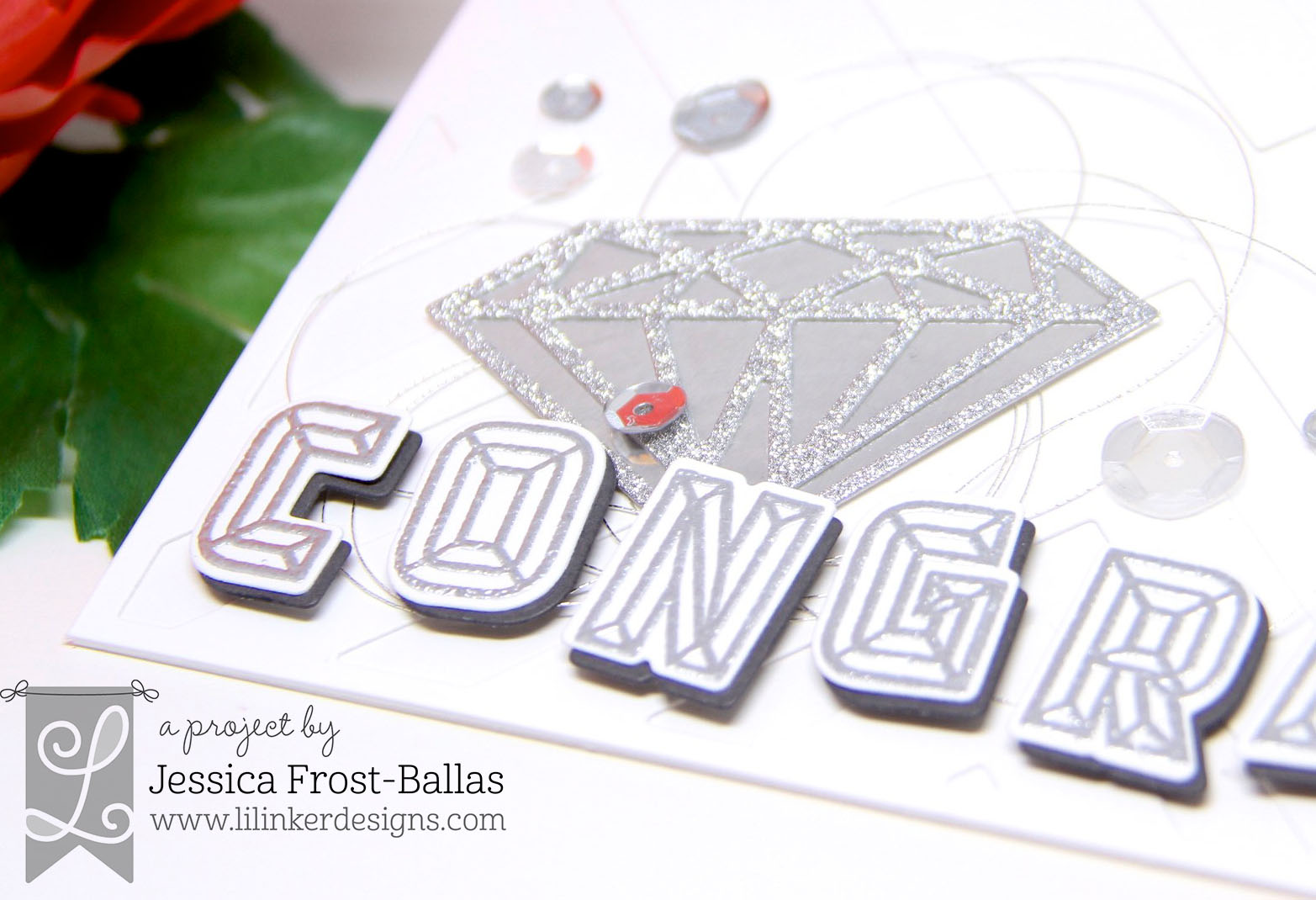 I also die-cut the same letters from a dark grey cardstock to create a shadow effect for each letter. Then I adhered the diamond over a tangle of silver metallic thread, adhered the letters with foam mounting tape, and added a sprinkling of clear and metallic silver sequins to finish the card!