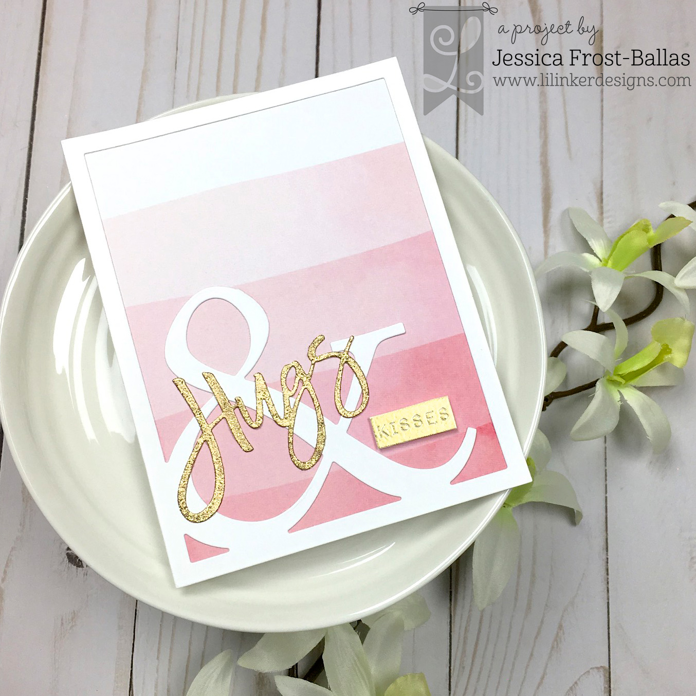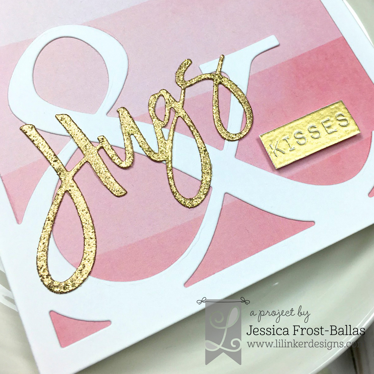 For my second card I combined a few older Lil’ Inker products with the new Brush Script Valentine’s Day Word dies. I love the All about Ampersand stamp and die set and thought it would be perfect with the brush script words! I die-cut the ampersand border with white cardstock and layered it over the Dip Dyed Ombre Paper Pad. Next I die-cut the word Hugs from white cardstock, pressed a versamark pad over it, and heat-embossed it with gold tinsel embossing powder before adhering it to the panel. Finally I heat-embossed the rest of the sentiment from All About Ampersand with gold embossing powder, fussy cut it, and popped it up with foam mounting tape!