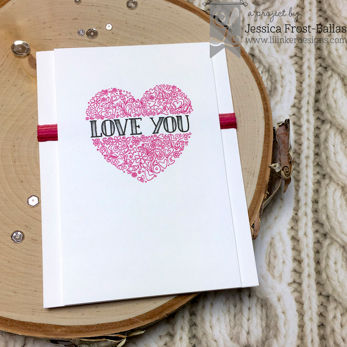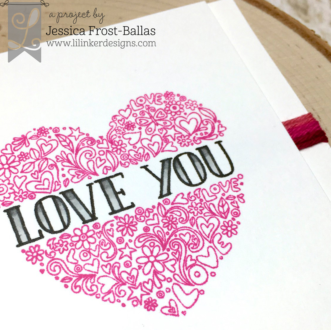 For my first card I kept things CAS. I stamped the Filled Heart with dark pink dye ink and the sentiment with black dye ink. Then I colored the sentiment with copic markers for a slight ombre effect. Finally I wound three shades of pink and red twine around a background panel and used foam mounting tape to adhere the panel on top of it.