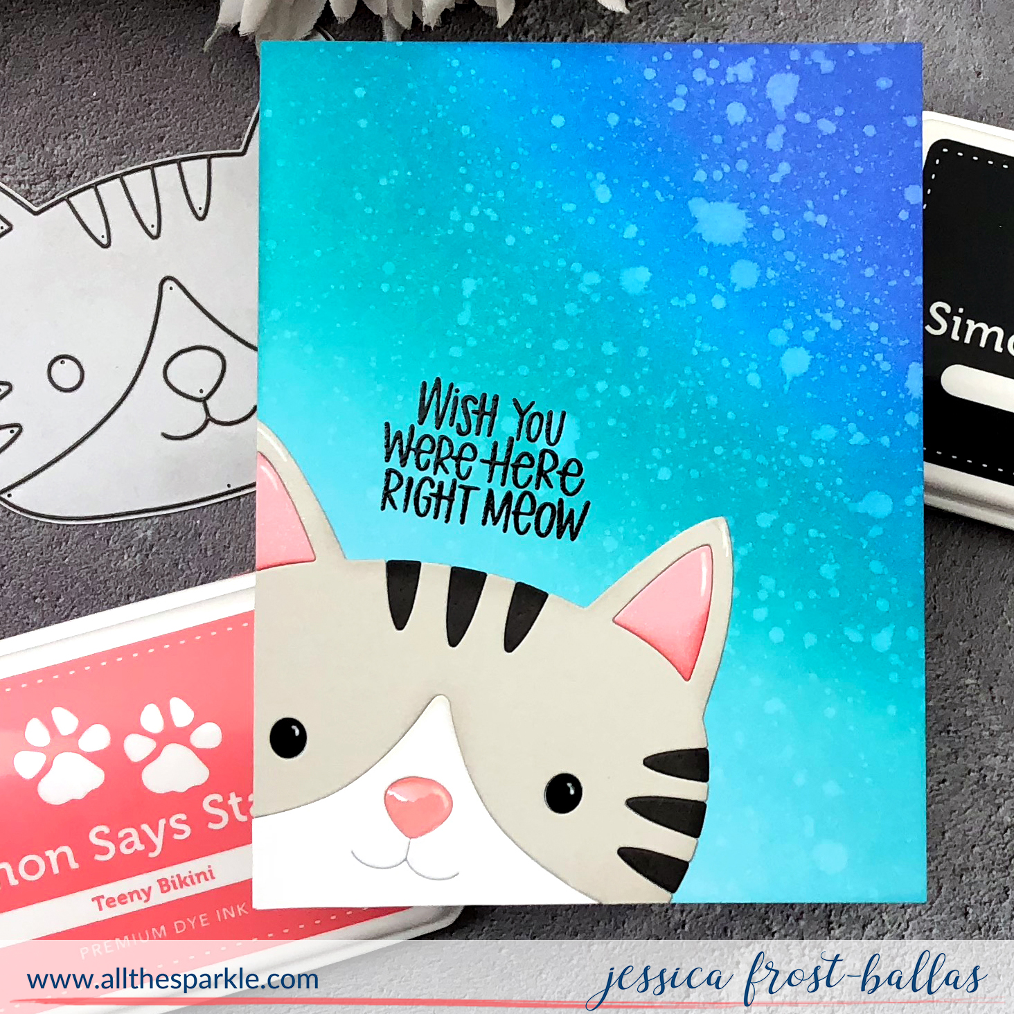 To start I blended blueprint sketch, mermaid lagoon, peacock feathers, and tumbled glass distress oxide ink onto an A2 panel of white cardstock. I spritzed the panel with water and blotted off the excess. Next I die-cut the cute Big Picture Book Kitty die from Simon Says Stamp fog, slate, black, white, and cotton candy cardstock. I added a little dimension to the pieces by blending fog ink onto the fog and white cardstock, teeny bikini ink onto the cotton candy cardstock, and slate ink onto the slate cardstock.