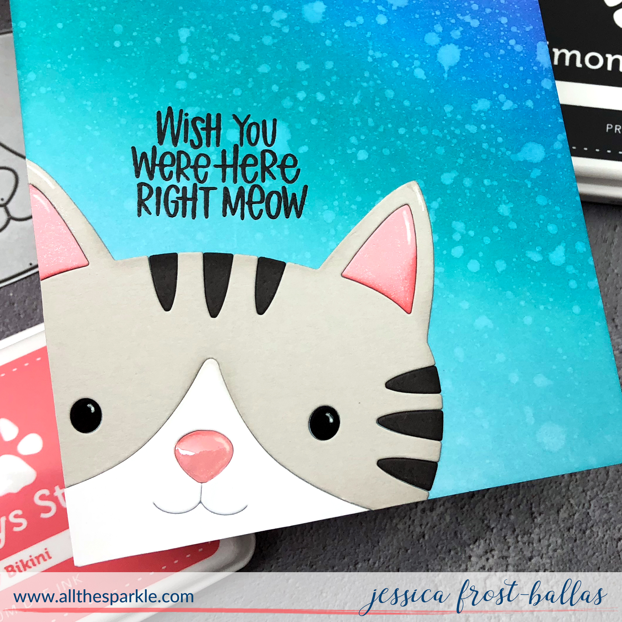 Next I adhered the kitty to the distress oxide blended panel and trimmed off the overhang. I added a few accents with a white gel pen and spectrum noir clear sparkle. Then I stamped the sentiment from Right Meow with versafine and heat-embossed it with clear embossing powder. Finally I added a little nuvo crystal glaze to the kitty’s nose for a little shine!
