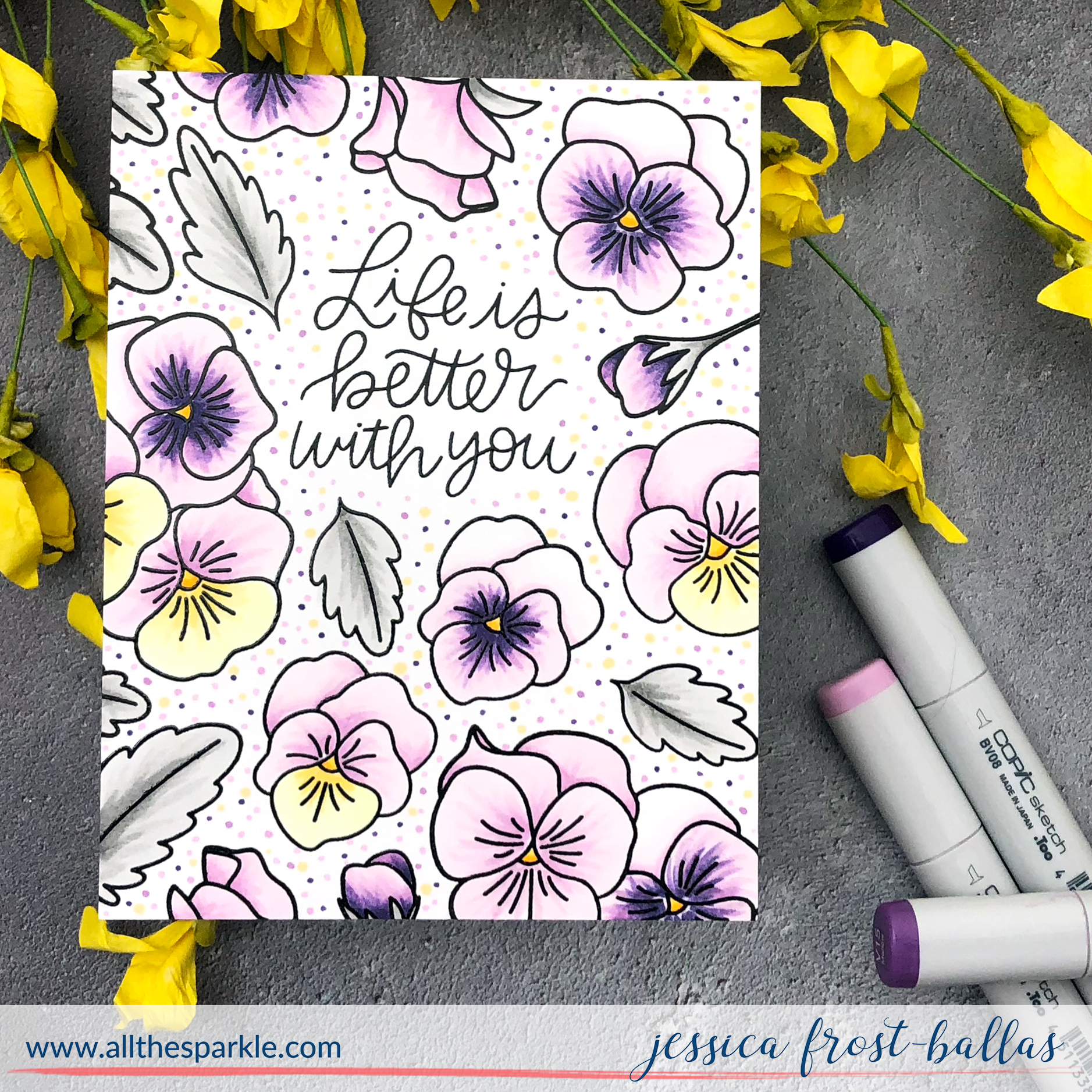 Next I used very simple copic shading to color my pansies. Most of them I colored in light and dark shades of purple but I added a little yellow to a few of them. I used the following copic colors: V0000, V01, V12, V15, V17, BV08, Y32, Y35, Y38, T1, T3, T5, and my colorless blender! Finally I added little dots of color to the empty spaces around my images using the same shades of purple and yellow to create a bright and cheerful card!