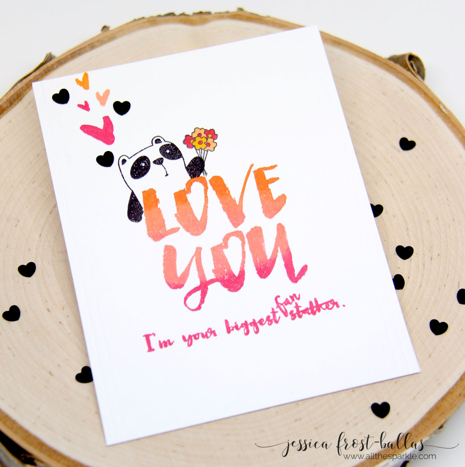 Next I took a post-it note and masked off the sentiment before stamping my panda. Masking allows the panda to look like he’s hiding behind the sentiment. I stamped the flower arrangement from the same set and colored it with copics to match the inks. I used the same inks to stamp a few hearts and then went over the hearts, sentiment, and flowers with my spectrum noir sparkle marker. Finally I added a few black confetti hearts from The Ton, scored two lines along the side of my card panel, and adhered it to a card base!