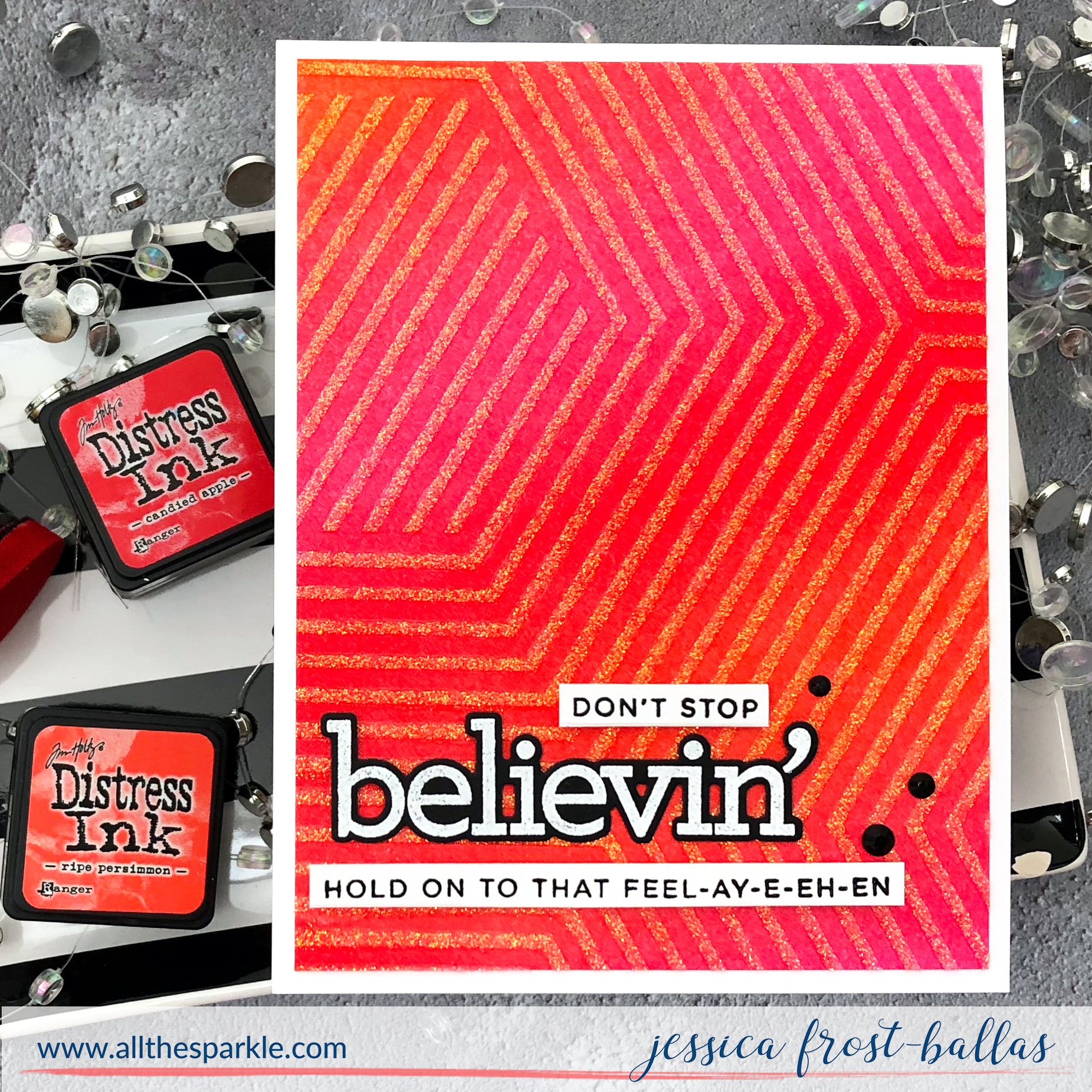 First I blended abandoned coral, picked raspberry, candied apple, and ripe persimmon distress inks onto a piece of strathmore bristol cardstock. Then I taped the Mod Stripe stencil over the panel and applied a thin layer of Nuvo Glimmer Paste in Moonstone!