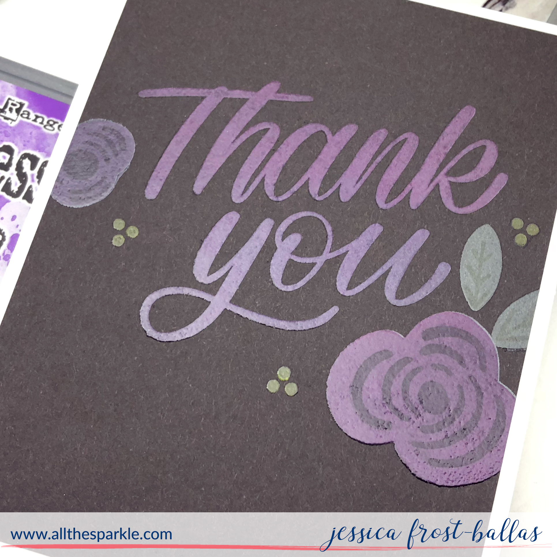 I love the look of color on dark cardstock but I didn’t feel like dragging out my colored pencils. So instead I used my distress oxides! I started by stamping the sentiment from Thank You Flowers onto dark grey cardstock with white pigment ink several times to lay a thick layer of pigment down against the dark cardstock. I let it airdry for a few minutes and then inked the stamp with wilted violet and seedless preserves distress oxide ink. Then I stamped the sentiment with versamark and heat-embossed it with clear embossing powder to seal in that pretty color!