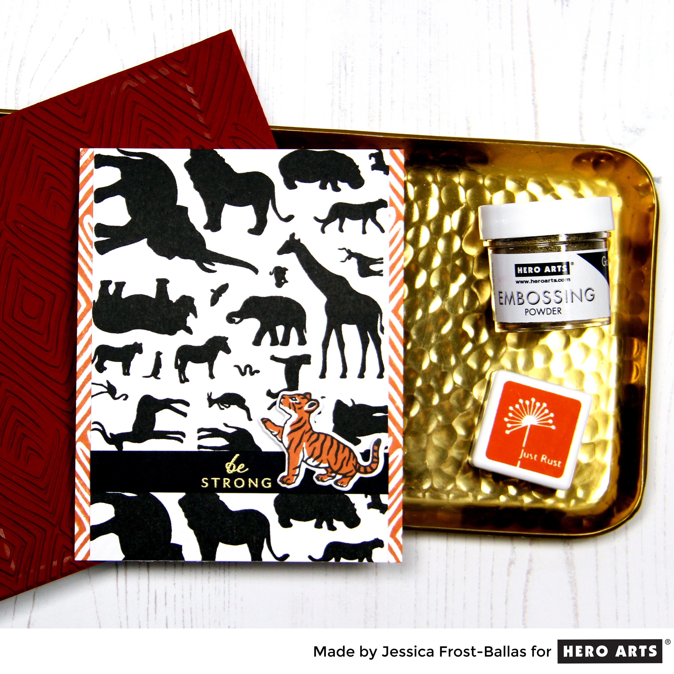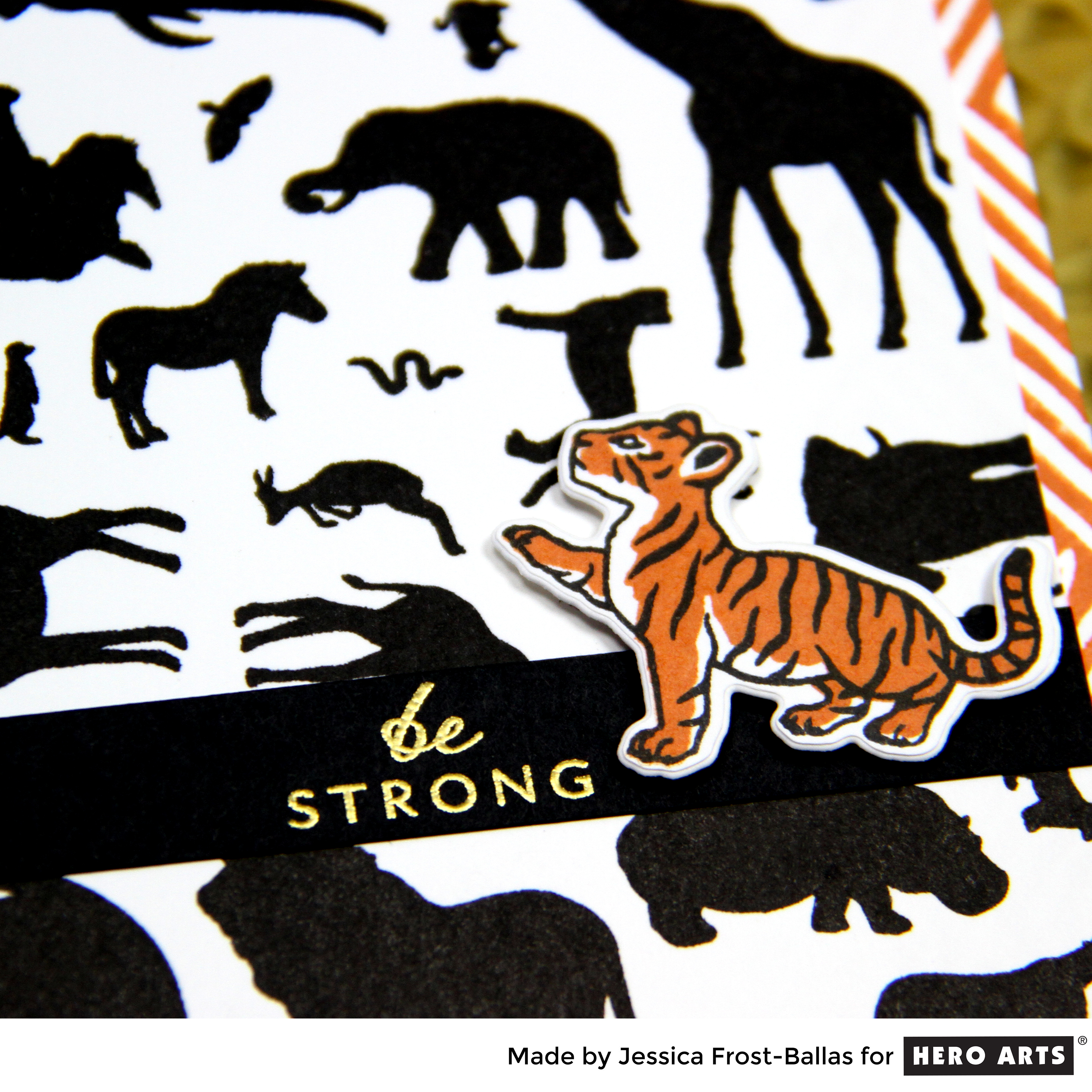 I used a couple add-on items with the main kit for my card. I started by placing a card panel in my MISTI and then I arranged the animal silhouettes in different directions on my panel and then closed the MISTI lid to get them to stick to the lid. Then I inked them with intense black ink and stamped them on the card panel. I restamped twice to get a crisp image and then trimmed my panel down to 3.75″ by 5.5.” Then I stamped the Tribal Stripes cling stamp onto white cardstock with Rust ink and adhered the animal panel over it.