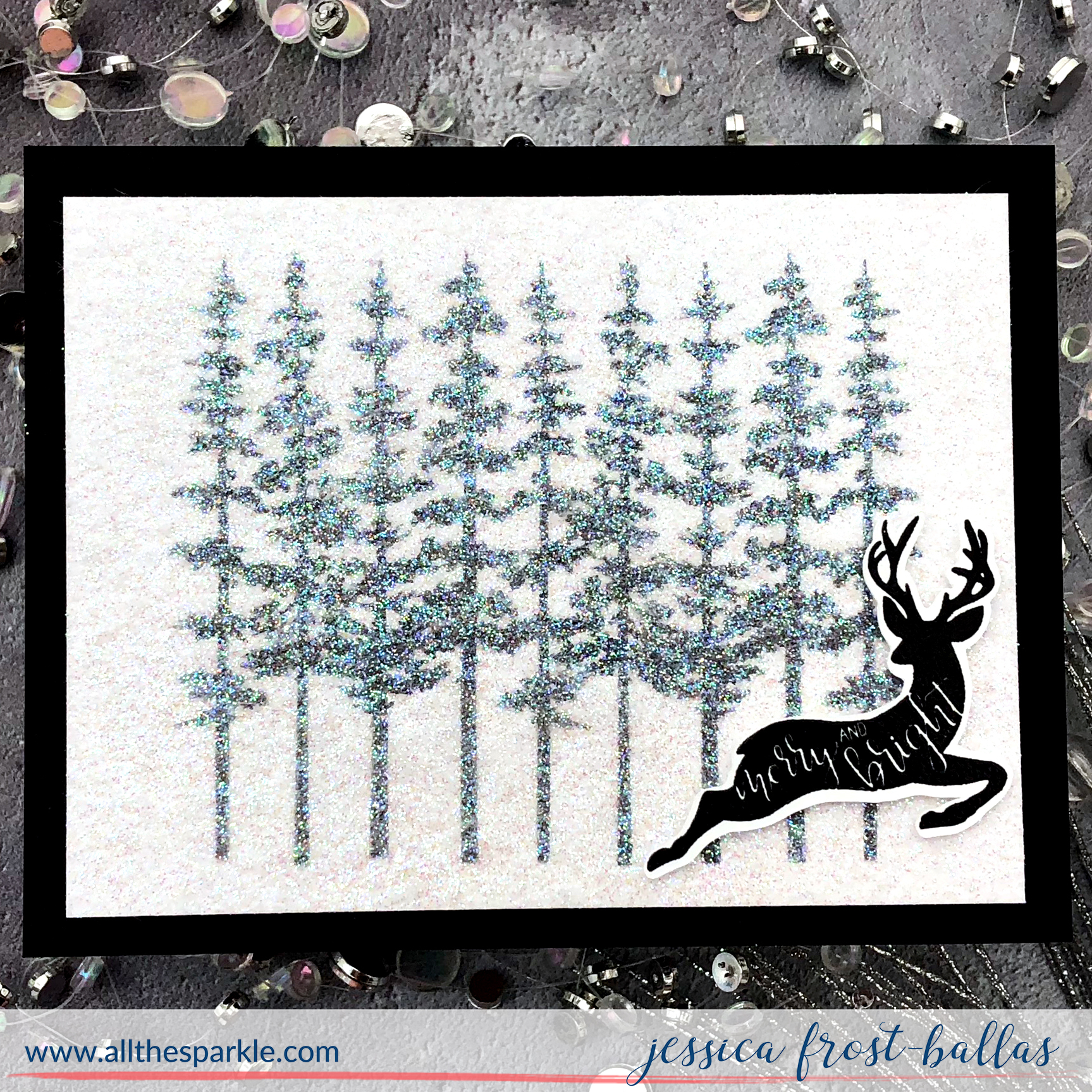 First I stamped the large tree border onto a piece of white cardstock with black ink. Next I placed a used dryer sheet in my overspray box and sprayed it thoroughly with spray adhesive. I placed the dryer sheet over the stamped panel and smoothed it over the surface. Then while it was still tacky I sprinkled it liberally with prisma glitter. I tapped off the excess and then placed a piece of copy paper over the glitter and burnished it with a bone folder. I removed the copy paper and let it dry completely.