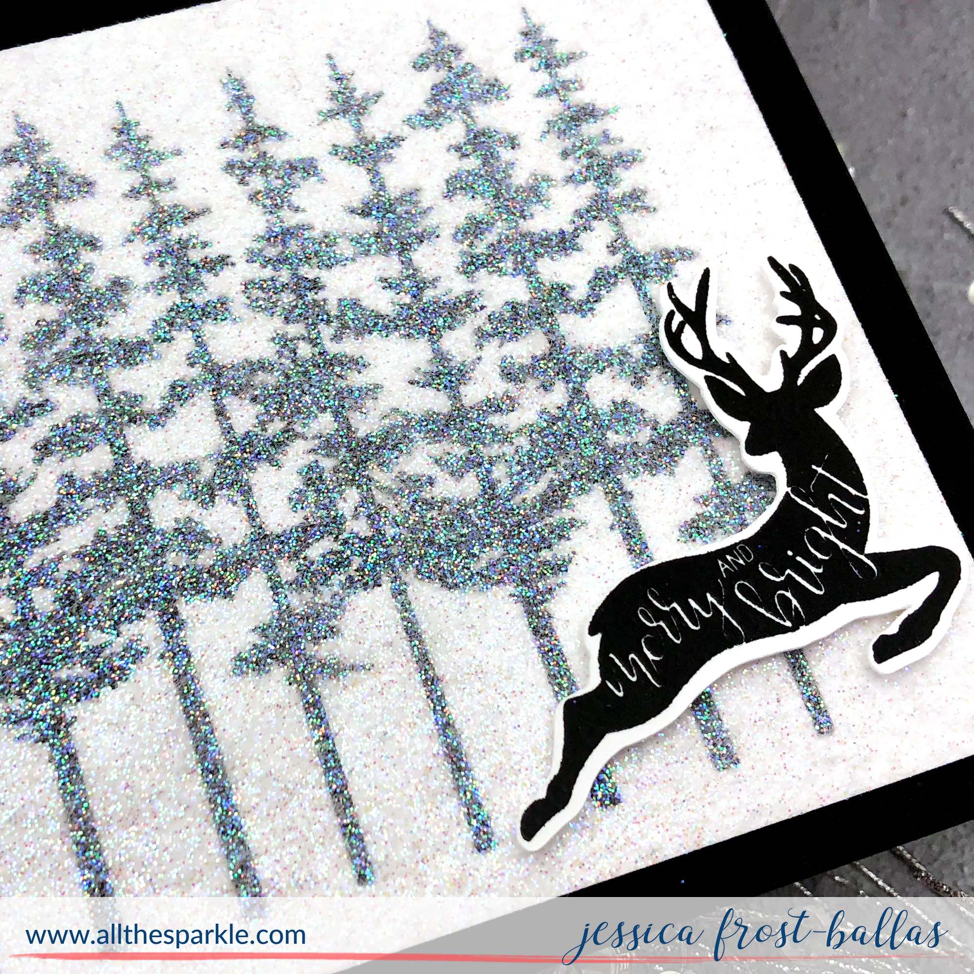 While that was drying I stamped the sentiment deer with versafine and heat-embossed it with clear embossing powder. Then I trimmed my panel down and adhered it to a black card base. I fussy cut the deer and adhered it to the panel with foam mounting tape. And that’s it!