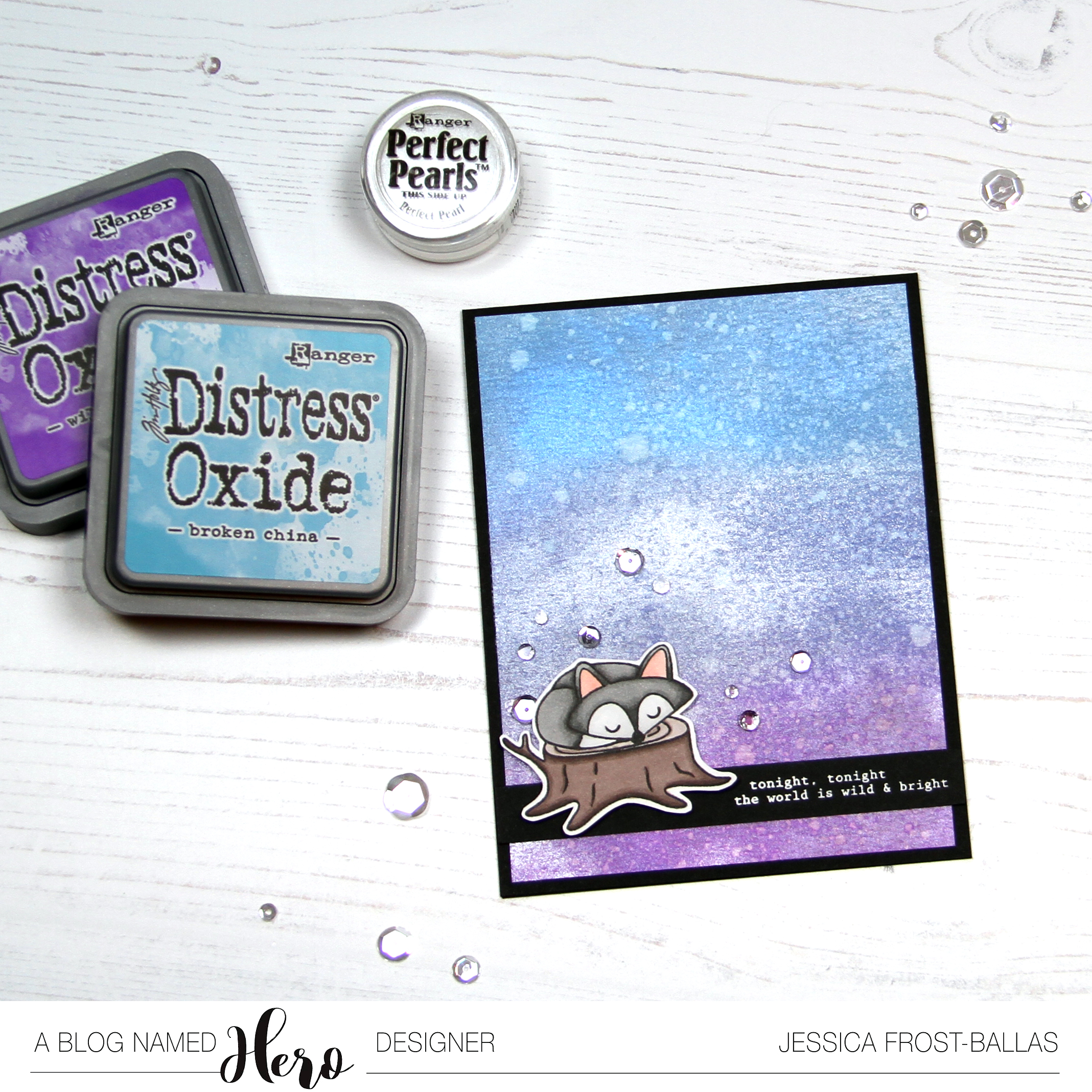 Next I blended broken china, faded jeans, and wilted violet distress oxides onto a piece of watercolor paper and spritzed it with water. Then I swiped a perfect medium pad across the card randomly and then brushed on perfect pearls powder. I used a swiffer to wipe off the excess and then spritzed it again with water to set the powder. I stamped the sentiment from Hero Arts Kelly’s Good Night onto black cardstock and heat-embossed it with white embossing powder. I adhered the distress oxide panel to a black card base and then added the sentiment and my fox. I used foam mounting tape to pop up my fox for a little more dimension. Finally I added a mix of Crystal Clear sequin fusion mix and the Sparkling Crystals embellishments to create sparkling stars in my night sky!