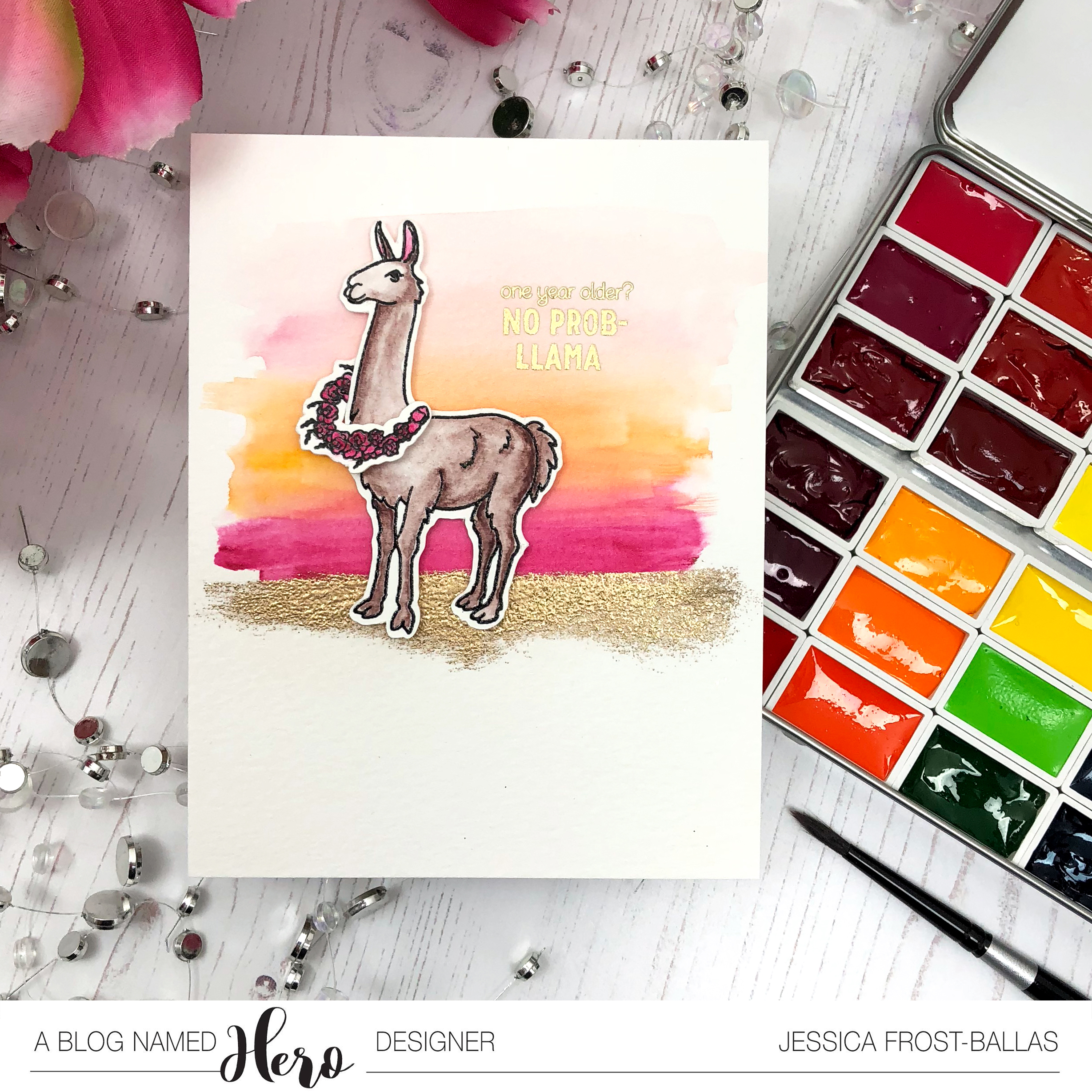 That llama just cracks me up! I started by stamping him and the floral wreath onto watercolor paper with versafine and heat-embossed him with clear embossing powder. Then I used my Mijello Mission Gold watercolors to paint him and the flowers. I die-cut them with the coordinating dies and then set them aside while I worked on the background.