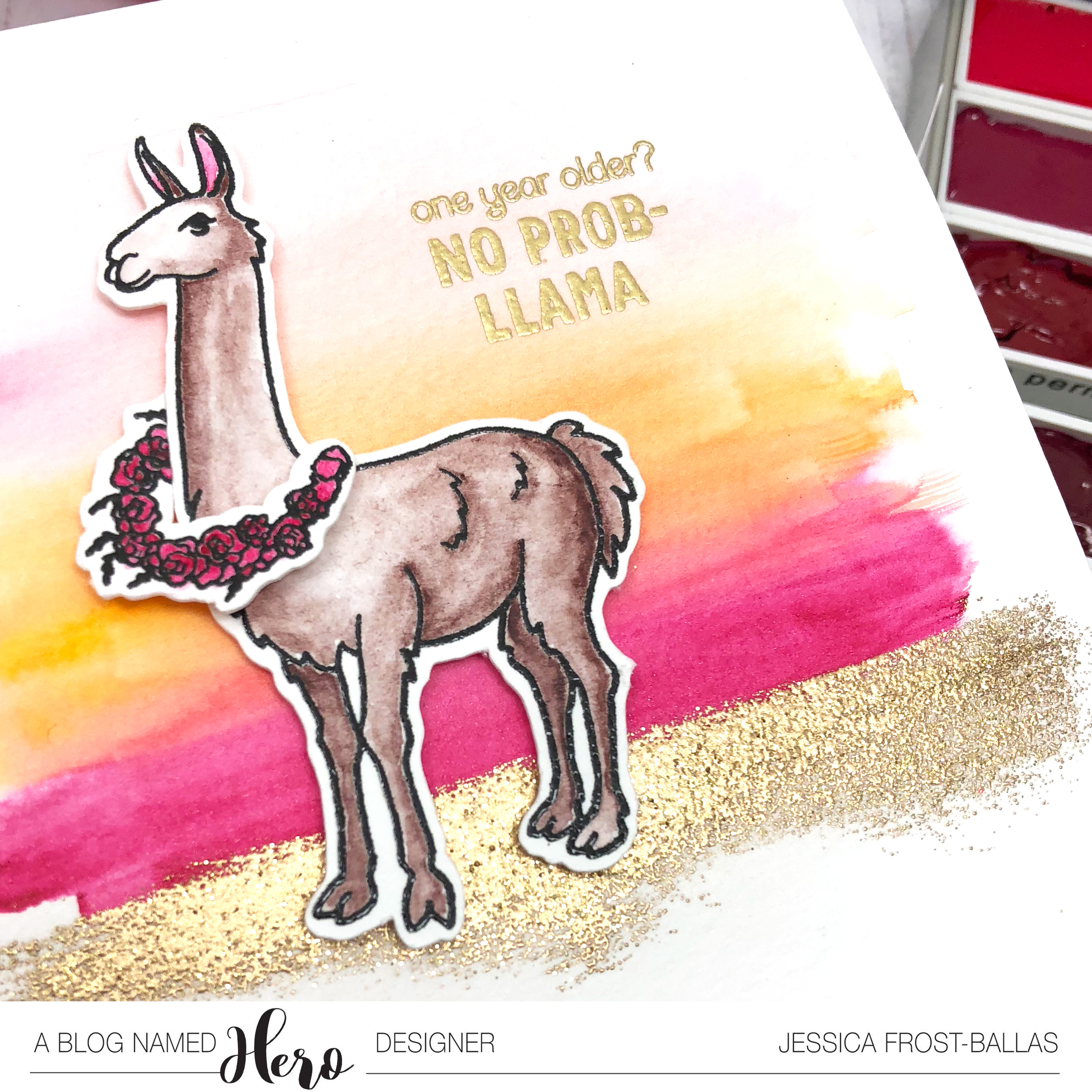 Next I took a piece of watercolor paper and added a wash of water to the top half. Then I added big stripes of pinks and orange to create an ombre sunset. I let it dry without blending the edges to create a bolder look. Once it was dry I swiped a versamark pad across the bottom of the watercolor wash. I heat-embossed it with gold glitter embossing powder to create a sandy desert for my llama. I stamped the sentiment with versamark and heat-embossed it with gold embossing powder. Finally I adhered my llama with foam mounting tape.
