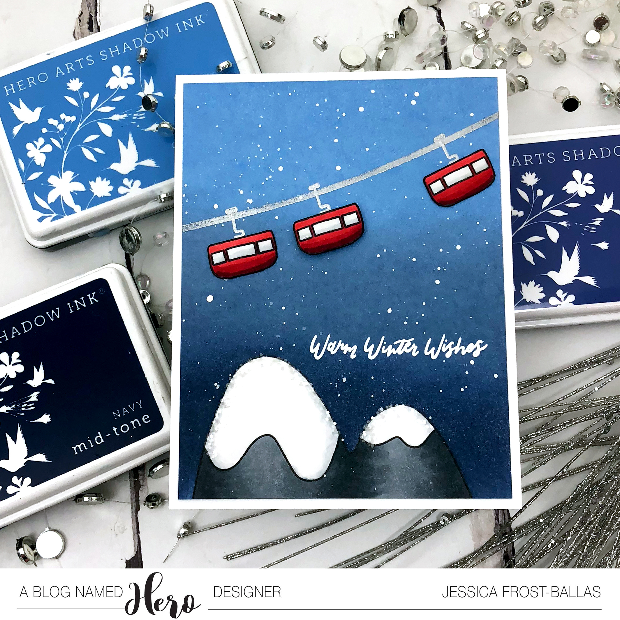 I love the modern feel of the new Ski Holiday stamp set from the Winter Catalog from Hero Arts and thought it’d be perfect for a cold wintery scene! To start I stamped the hills with intense black ink and then masked them with a post-it note. Next I blended Navy, Stone Wash, and Cornflower ink onto the panel. I flicked it with white acrylic paint and set it aside to dry. While it was drying I stamped the cars onto white cardstock and colored them with copics before fussy cutting them.