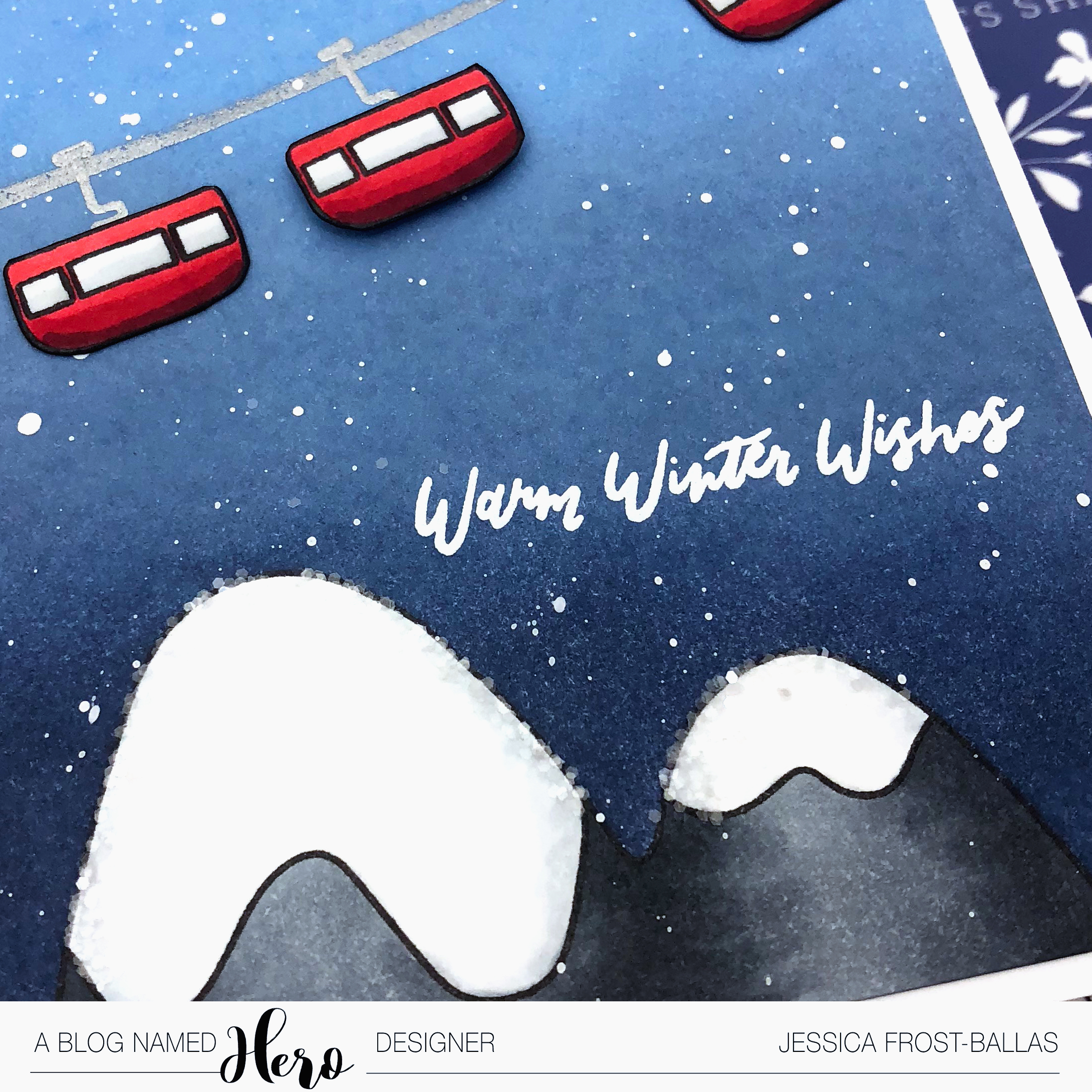 Once the background panel was dry I removed the post-it notes and colored the hills with copic markers. I stamped the sentiment and heat-embossed it with white embossing powder. Then I stamped the cable line and frame with versamark and heat-embossed it with silver glitter embossing powder. I adhered my cars with foam mounting tape and added a layer of nuvo crystal glaze for a little extra shine. Finally I added a little extra crystal glaze to the top of my hills and sprinkled it with snowfall glitter for even more sparkle!