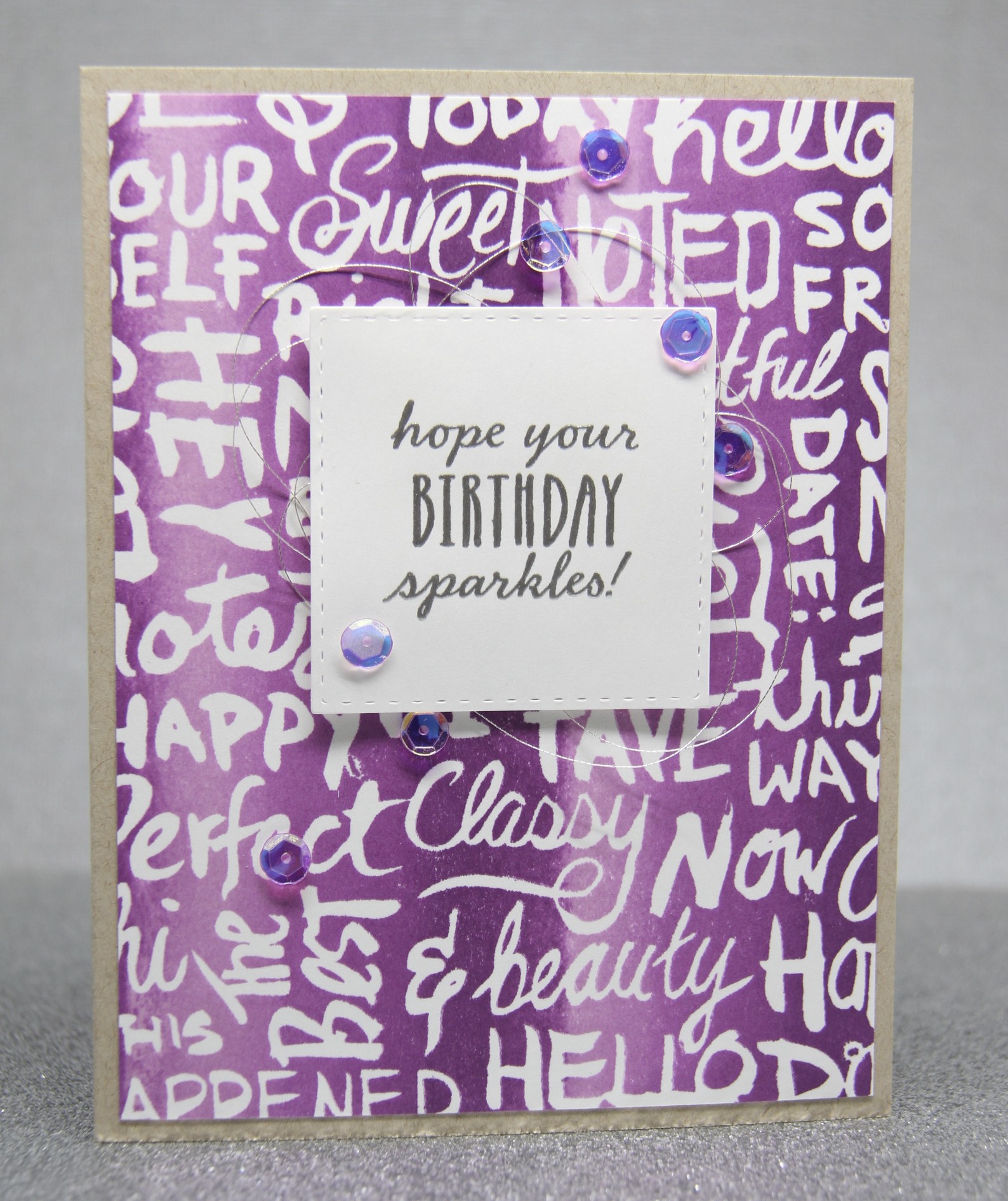 Next I stamped my sentiment with versamark and heat-embossed it with silver superfine embossing powder. I adhered it over a tangle of silver metallic thread and added a few purple iridescent sequins from Pretty Pink Posh, our September collaboration partner!