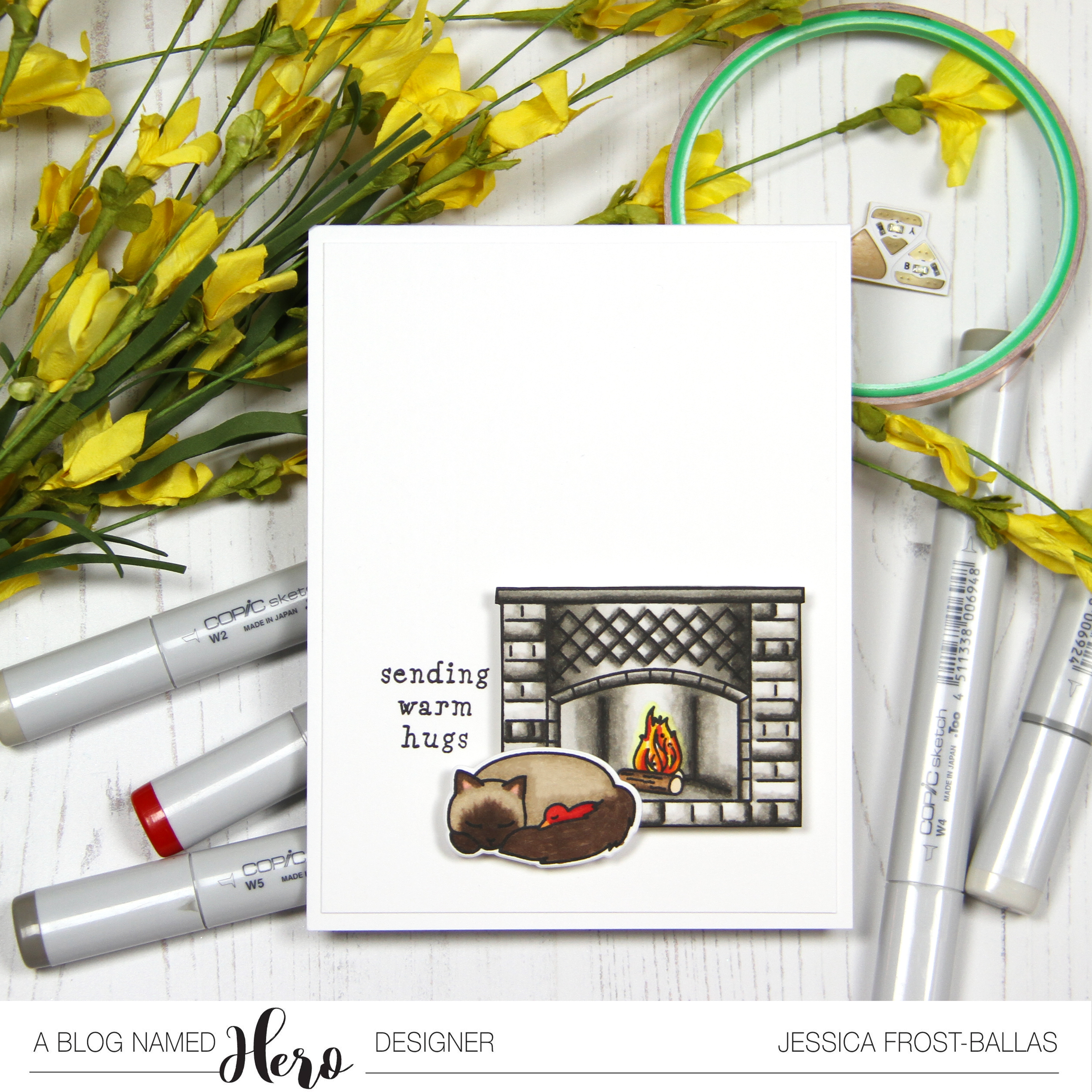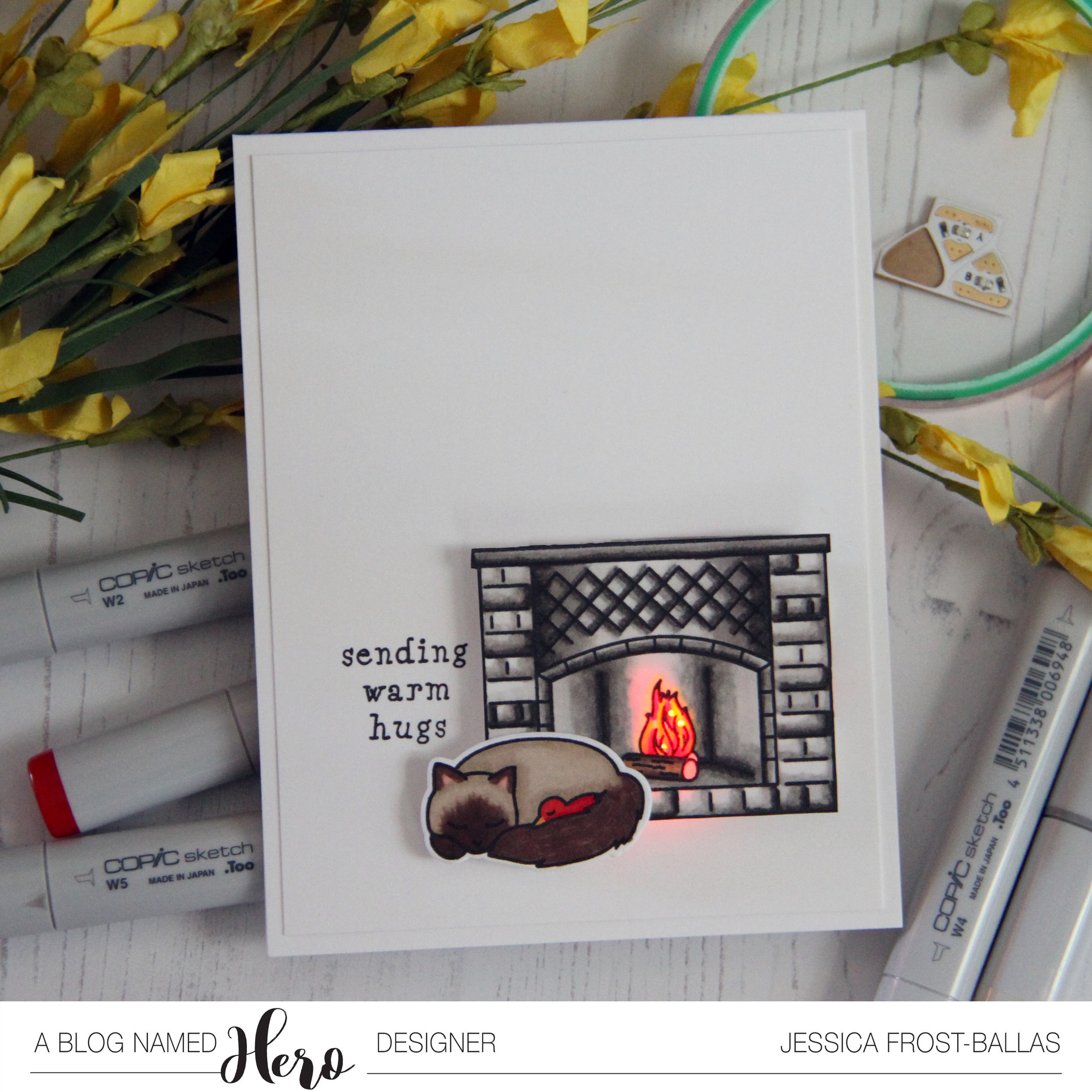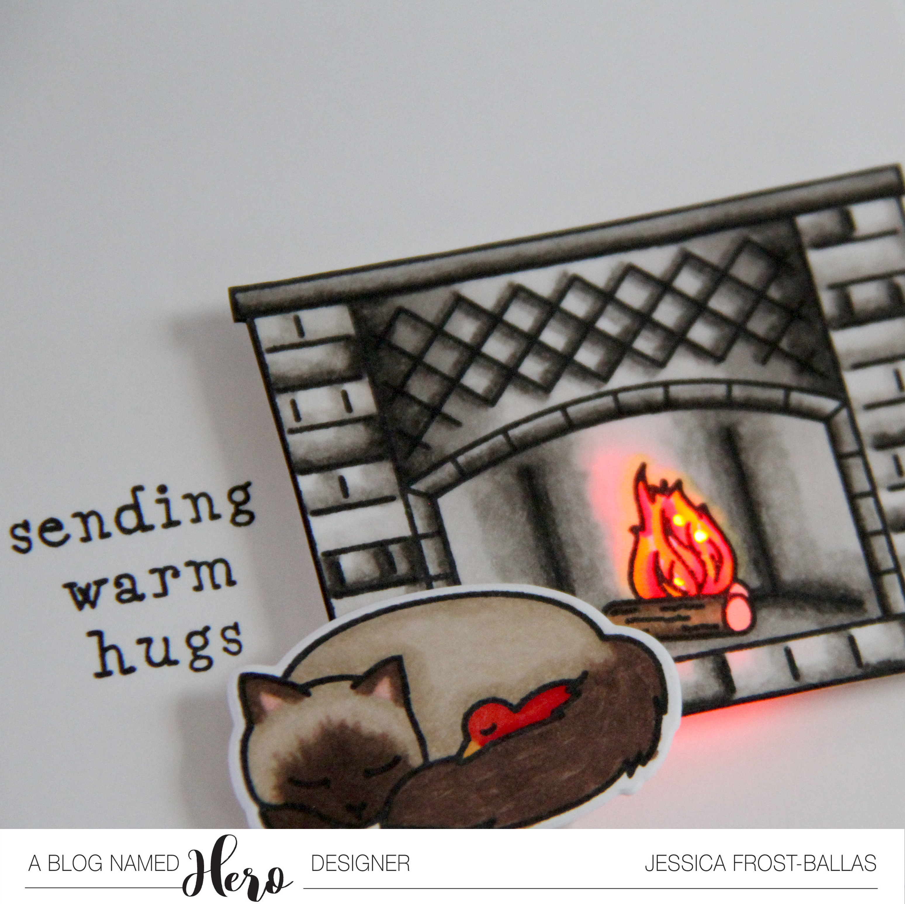 To start I stamped my fireplace and cuddling cat and bird from Welcome Home onto white cardstock with copic-friendly intense black ink and colored them with copics. I used the coordinating die to die-cut the cat and then fussy cut the fireplace. I poked three small holes in the flames for the light to shine through. I used a pencil to mark where my fireplace would go on my card base and then stamped the sentiment to the side. I built my Chibitronics circuit on the card base and then added a triple layer of foam tape around the circuit.