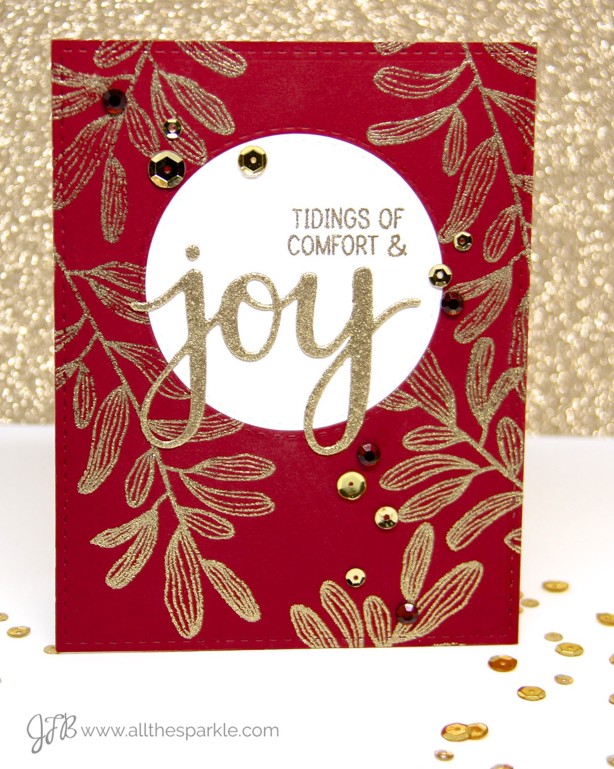 I started off by embossing the mistletoe onto red cardstock with gold tinsel embossing powder. I stamped the beginning of my sentiment onto a white die-cut circle and embossed it with the same powder. Next I die-cut a circle from the center of my red panel and inserted the die-cut circle. I used the leftover white cardstock to die-cut the word ‘joy’ and heat-embossed it with gold tinsel embossing powder to create a glittery die-cut. I adhered that to my card base and added a few gold sequins and red gemstones to finish my glitzy holiday card!