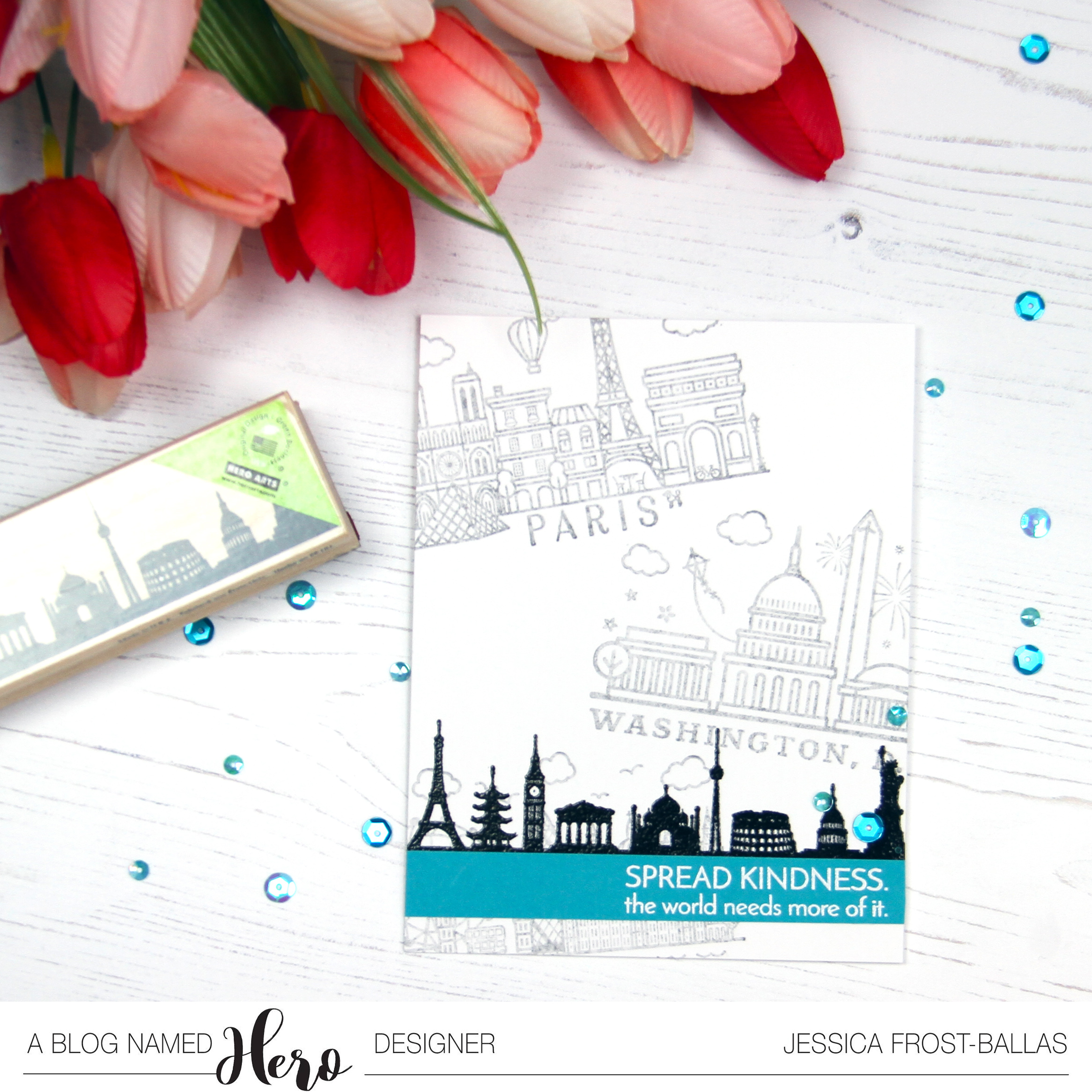 One of my favorite aspects of this challenge blog and the design team is how diverse our team is and the international friendships I’ve made over the last two and a half years! So I wanted to incorporate that feeling into my card! I started by inking the London, Paris, and Washington DC Destination sets with charcoal ink, stamping them once on scrap paper, and then stamping them again on my card panel for a softer, muted look. Then I stamped the International Skyline stamp across the bottom of my card with versafine and heat-embossed it with clear embossing powder. Next I stamped the sentiment from Uplifting Thoughts onto Audrey Blue cardstock with versamark and heat-embossed it with white embossing powder. I trimmed it down and adhered it to my card and finished by adding a sprinkling of ombre ocean sequins!