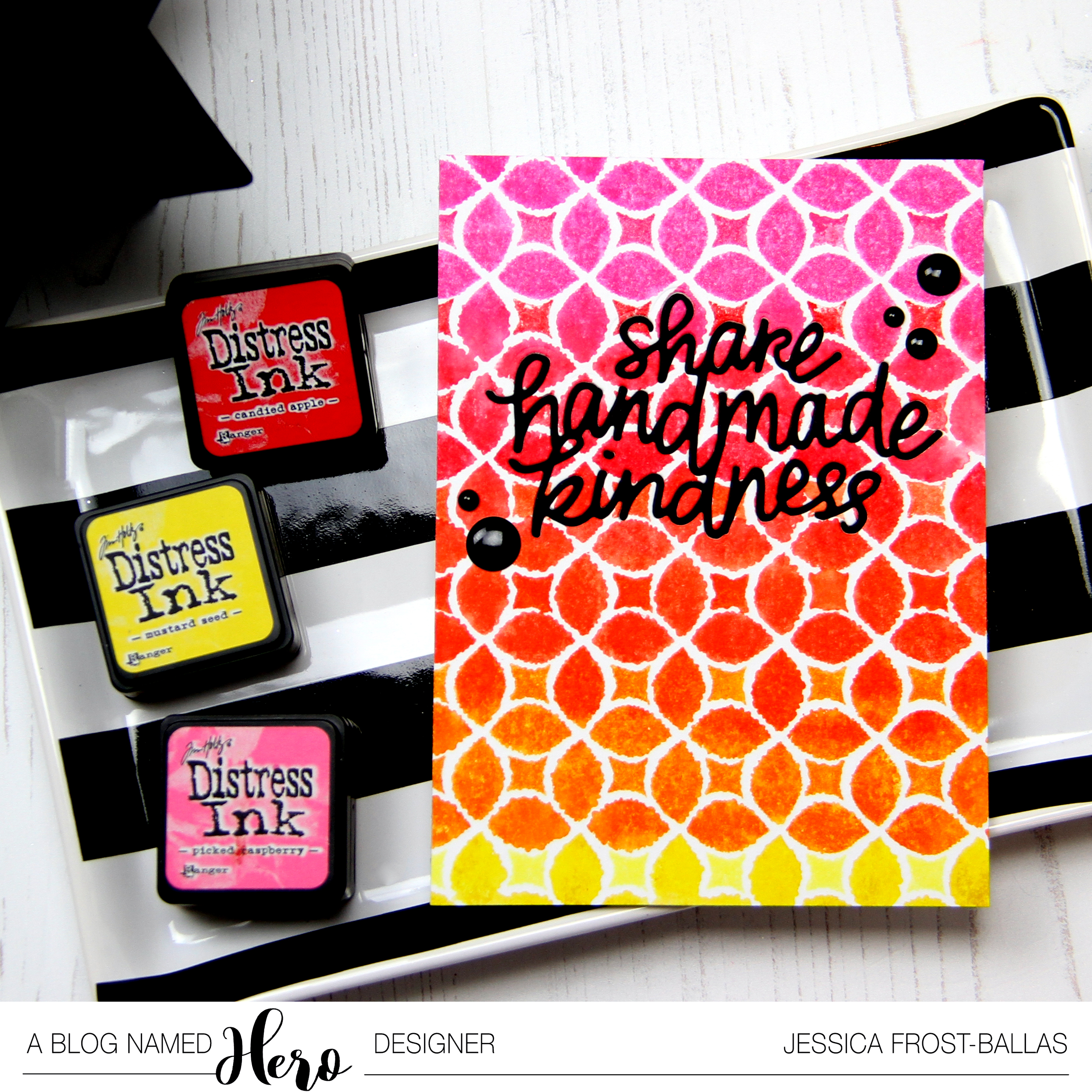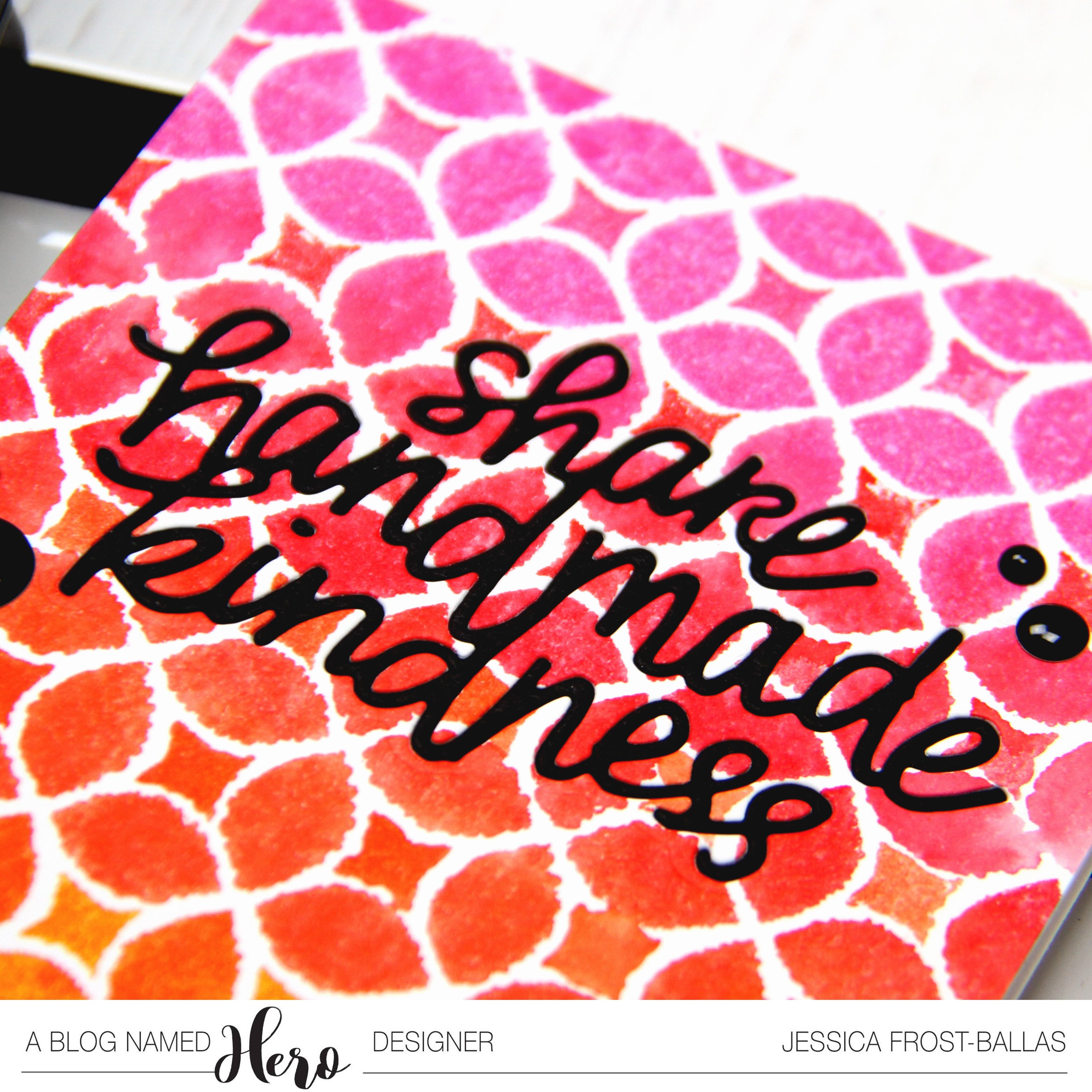 While it was drying I die-cut the Share Handmade Kindness sentiment from black cardstock. After the panel dried I die-cut the sentiment from the watercolor panel but reserved all the pieces. I adhered the watercolor panel to a card base with lots of adhesive (I still consider this technically one layer because the main panel is a single layer…I don’t like to use watercolor paper for the card base because it’s difficult to write on since it’s textured) and then fit the black cardstock sentiment into the panel. I tucked the reserved pieces of watercolor paper back into the panel (like the center of the a’s and the d’s) and finished the card with a few nuvo drops.