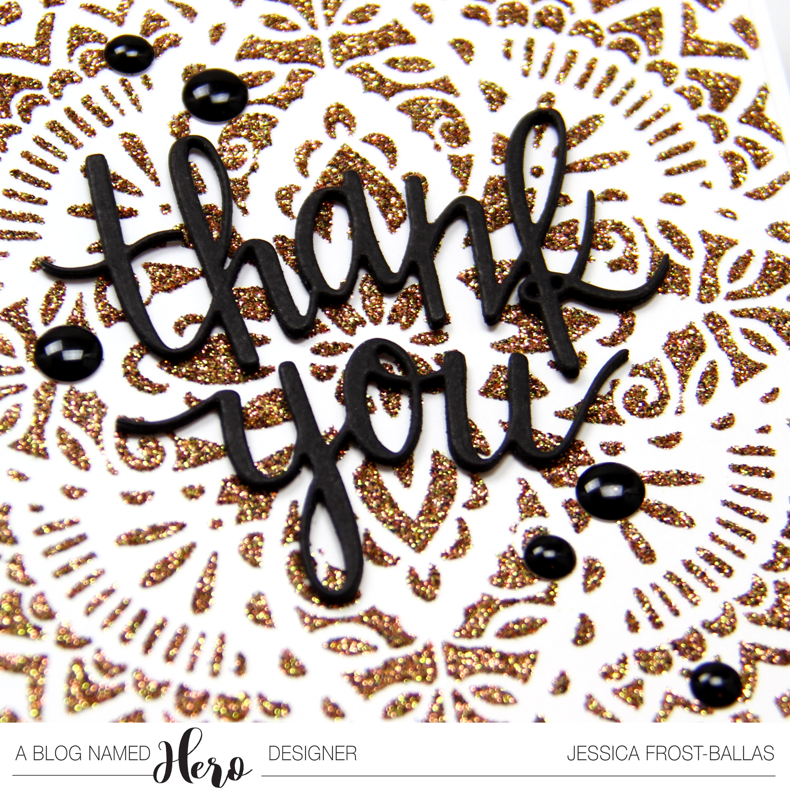 Once it was dried I tapped it vigorously to remove any excess glitter and used a dry paintbrush to wipe away any stray pieces of glitter. Then I die-cut the Thank You die three times using black cardstock and stick-it adhesive and adhered them together to create a thick chipboard-like sentiment. I adhered that to the glitter and added a few black enamel dots to finish the card!