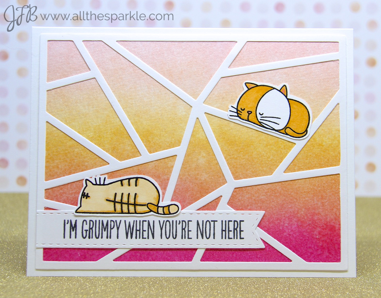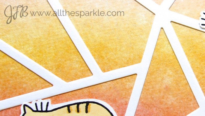 Ha…I still haven’t figured out how to color a tortoiseshell cat with copics so I’m sticking with tabbies… 😉 For my first card I blended distress inks in Spun Sugar, Dried Marigold, and Picked Raspberry onto Canson watercolor paper and let it dry. To add sparkle to this background I covered (read wasted) it with wink of stella clear glitter. It’s hard to see in the photo and up close it barely shows up. Don’t get me wrong…it’s shimmery but it’s not sparkly. I much prefer to use wink of stella in more concentrated doses in smaller applications like a sentiment or small image (like a heart). It’s definitely not financially worth it to use wink of stella on a large area.