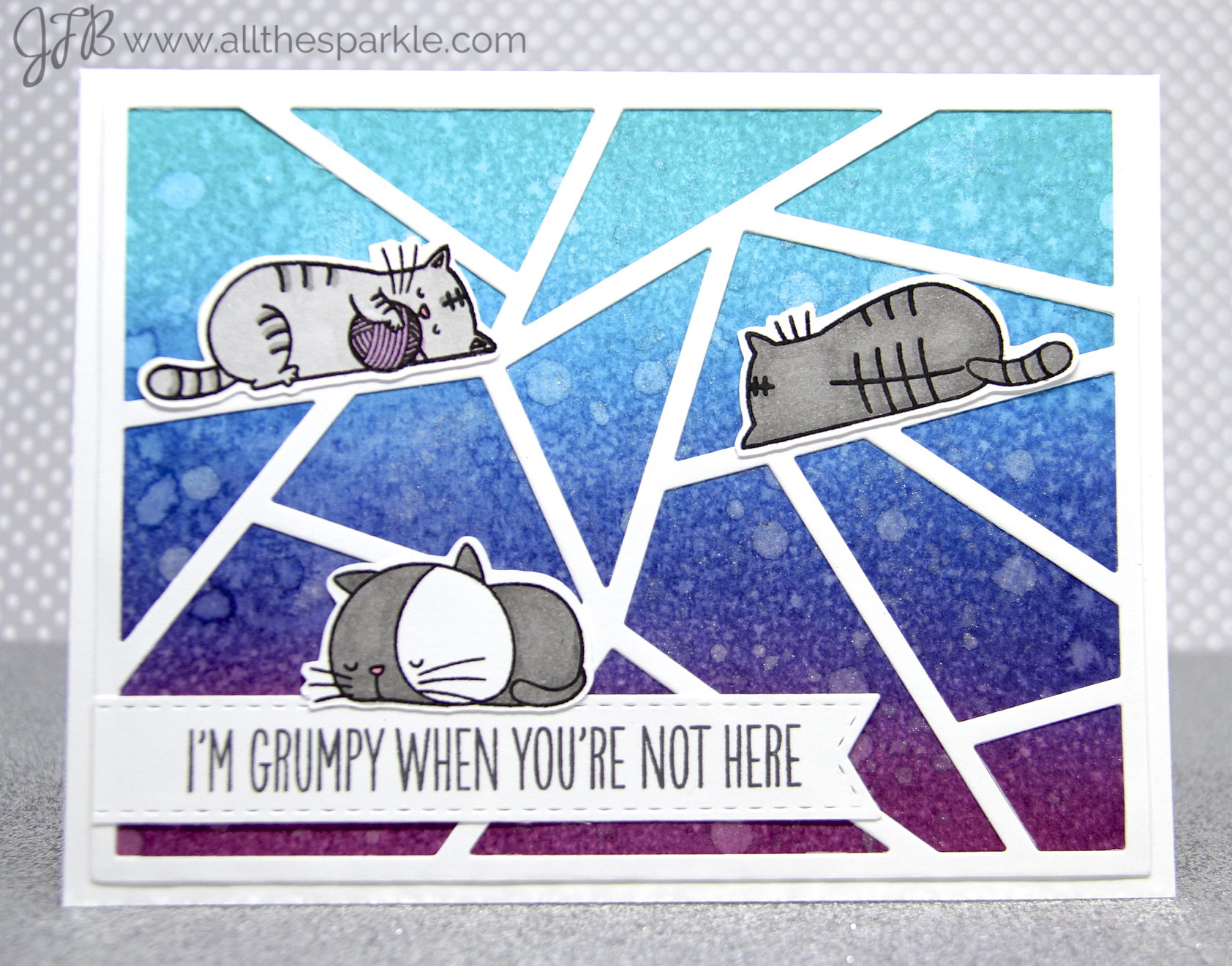 I love how you perched those cats on the die cuts, they are too cute! Gorgeous backgrounds on every one of your cards!