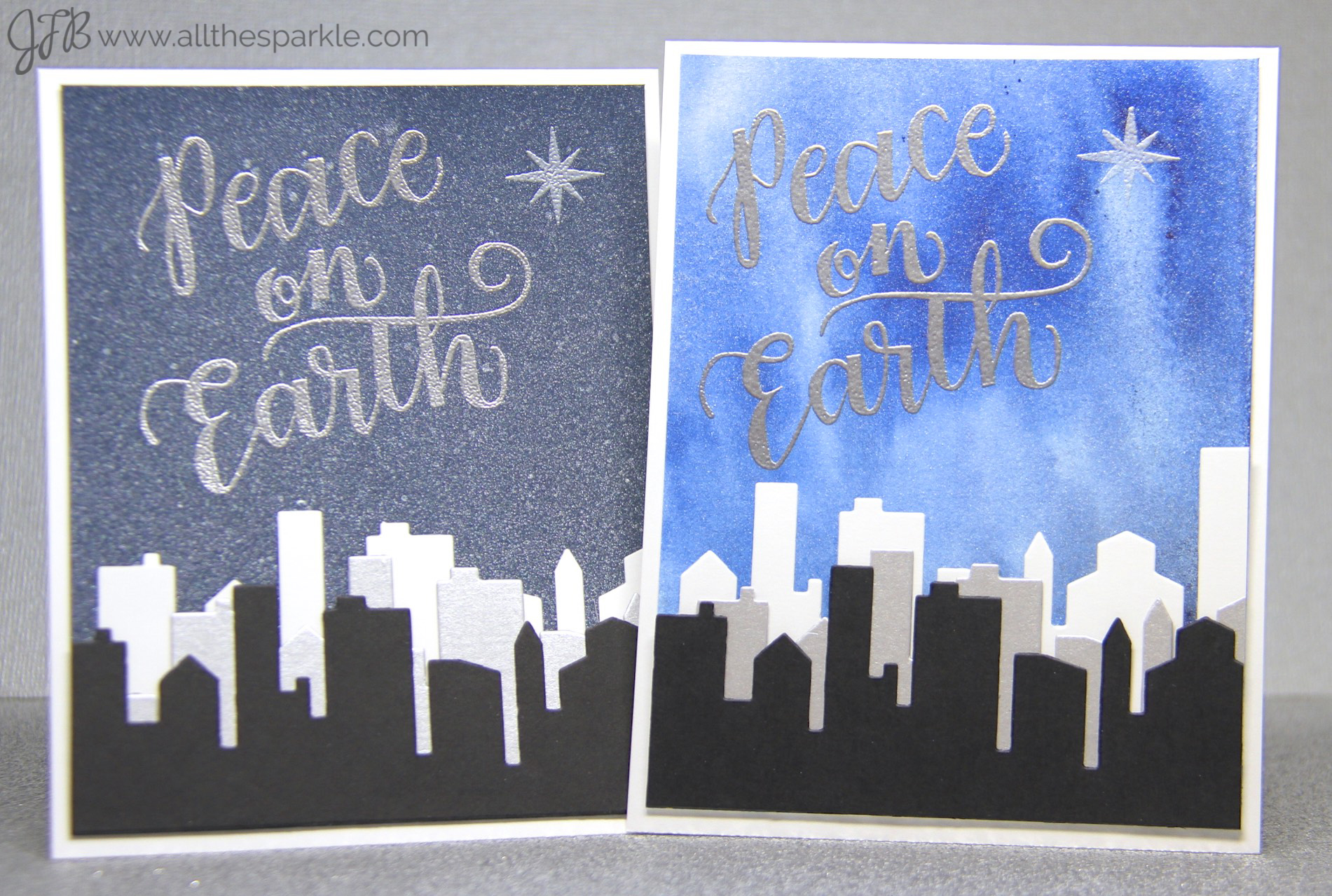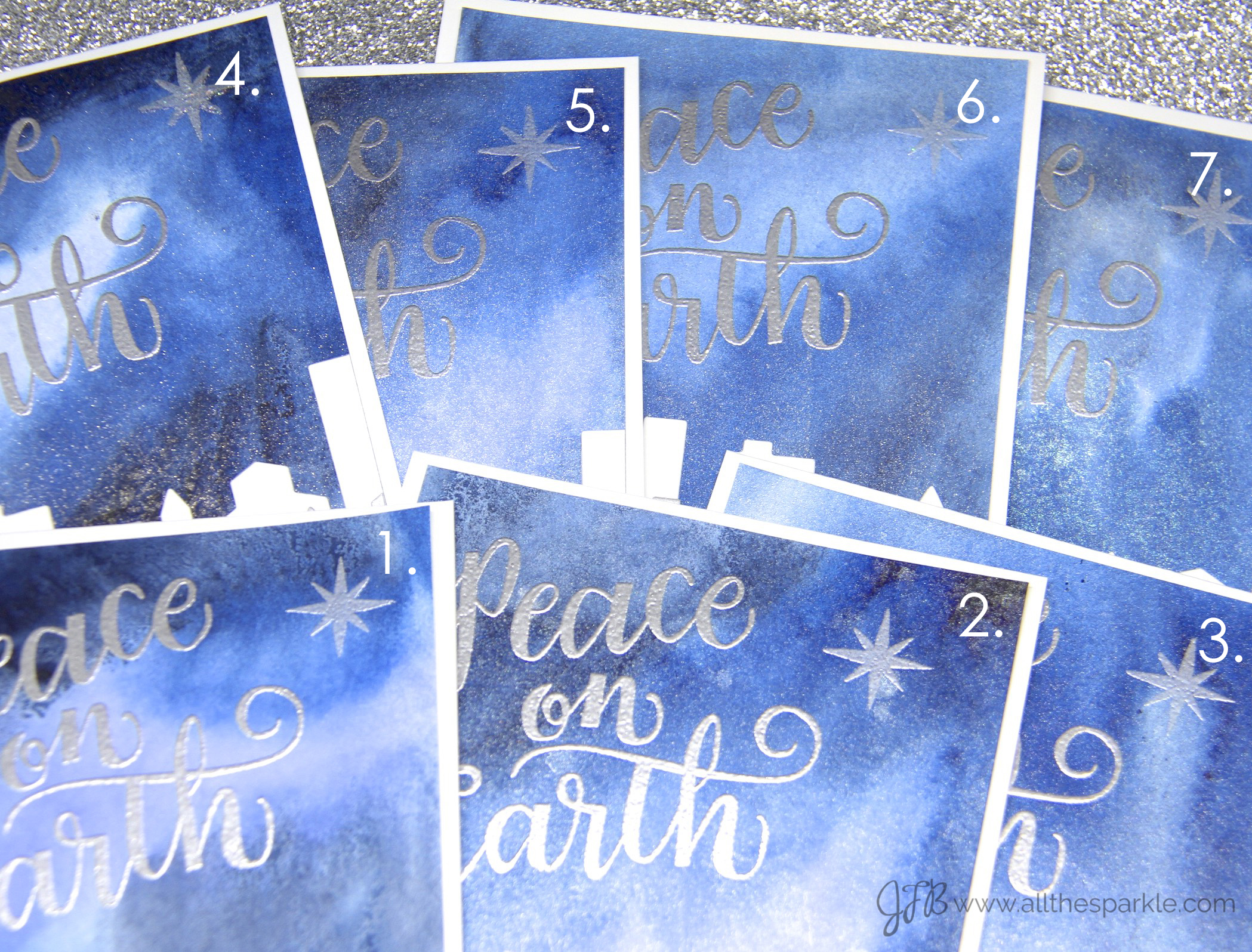 To complete the cards I went over the panel with my embossing tool and then stamped the large sentiment from Mama Elephant and heat-embossed it with silver embossing powder. I also stamped the star and embossed it with silver pearl embossing powder. Next I die-cut the landscape silhouette from Memory Box with white, silver, and black cardstock. I offset them and layered them together. I trimmed them down to fit the background panel and then mounted the background panel on a white cardbase. So here’s a close-up look at each shimmer spray and finished card! First up the plain cardstock and plain watercolored backgrounds: