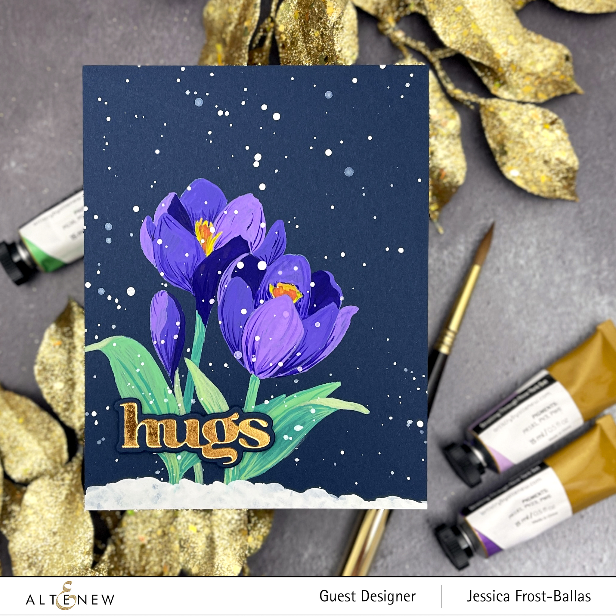 I stamped the Winter Crocus onto dark navy blue cardstock with white pigment ink to use as a reference for my painting. Then I painted one section at a time allowing the paint to dry completely before coloring a touching section. Unlike watercolors I didn’t want the paint colors to mix and blend. This wasn’t the fastest card I’ve ever created but I really enjoyed the time I spent carefully painting each segment. The gouache is rich and creamy and a little goes a very long way when you’re working!