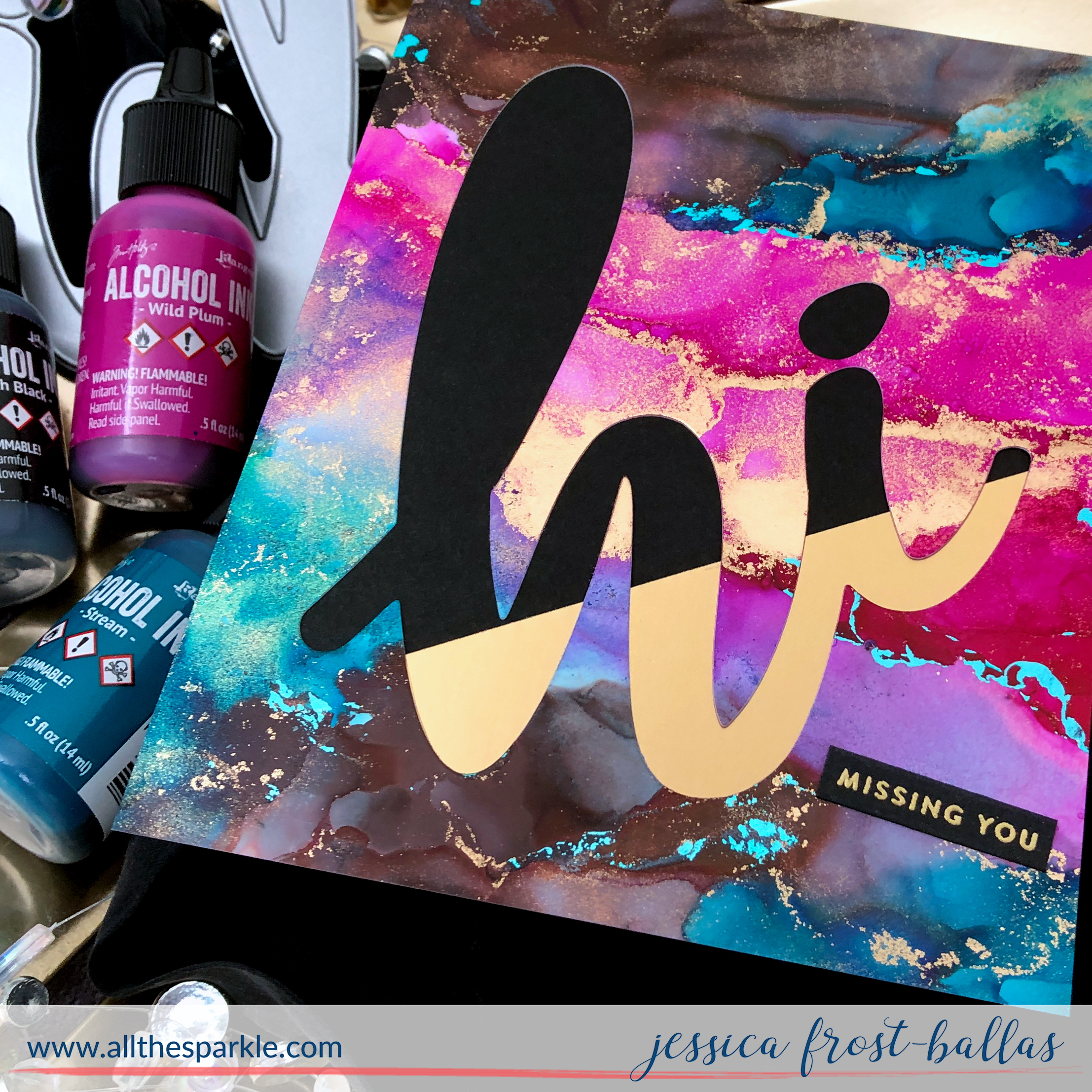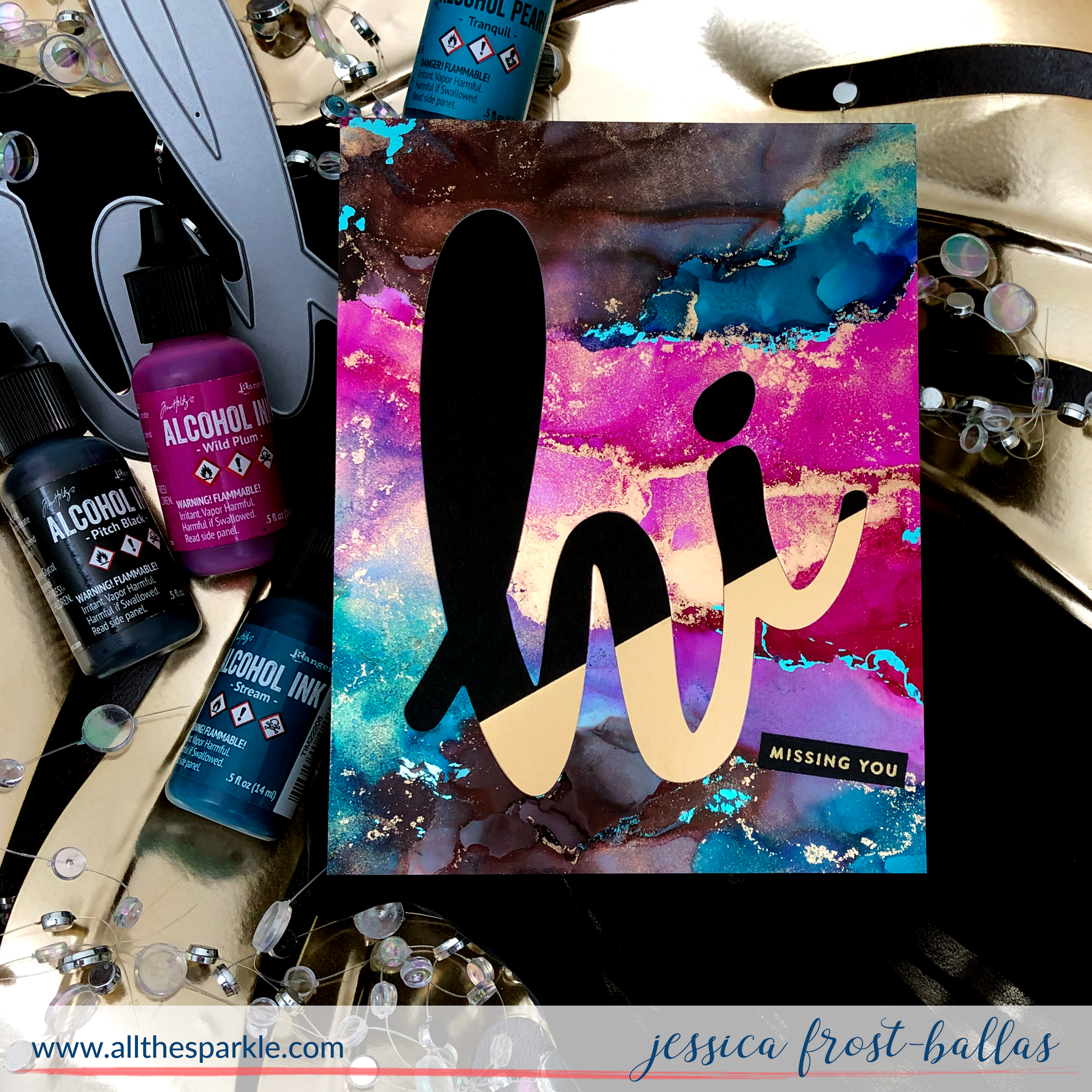 Once the panel was totally dry I die-cut it with the Big Hi die from The Stamp Market. I prefer to use medium weight yupo paper when I intend to do die-cutting…the heavy weight paper is a little hard to cut through. Yupo is a synthetic plastic paper so it doesn’t quite cut the same way cardstock would. Next I took a panel of black cardstock and applied gold matte cardstock to the bottom at an angle. I adhered the alcohol ink panel above to create the look of a gold-dipped sentiment. Finally I stamped the rest of the sentiment onto black cardstock, heat-embossed it with gold embossing powder, and trimmed it down to a thin label before adhering it to the panel with foam mounting tape!