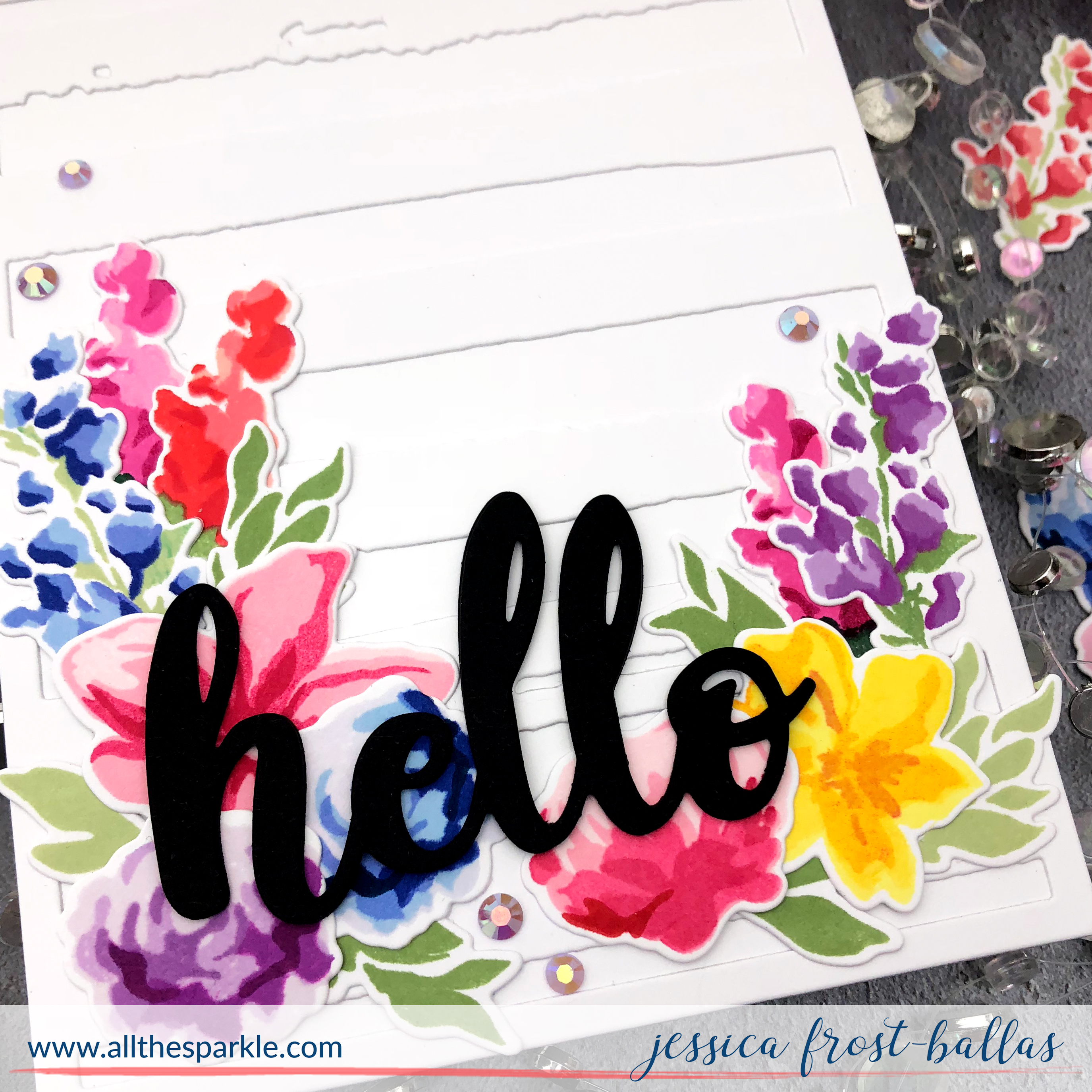 Next I die-cut the Simply Said Hello die with black cardstock three times, adhered them together and adhered it over the florals. I finished this card with a few purple pansy jewels!