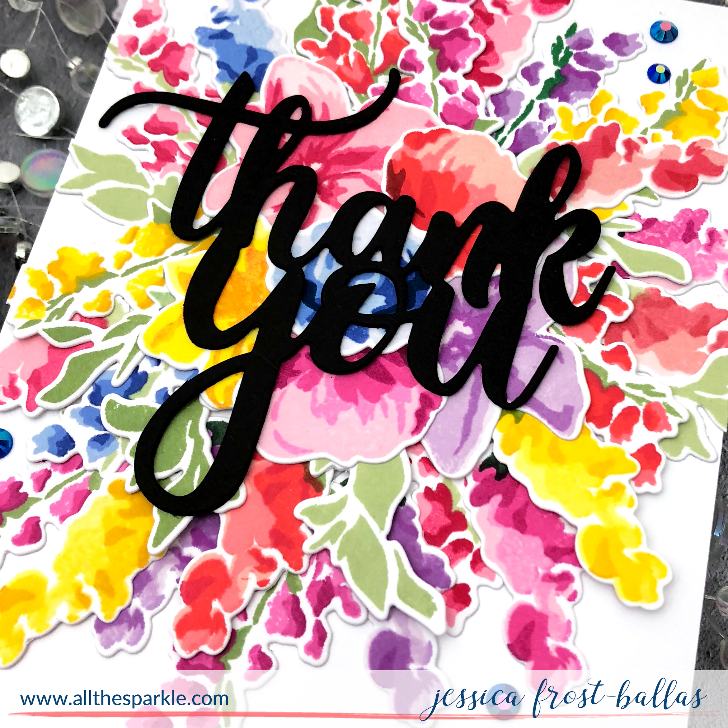 Then I die-cut the Simply Said Thank You die three times with black cardstock, adhered them together and adhered them over the florals. I finished the card with a few amethyst jewels.