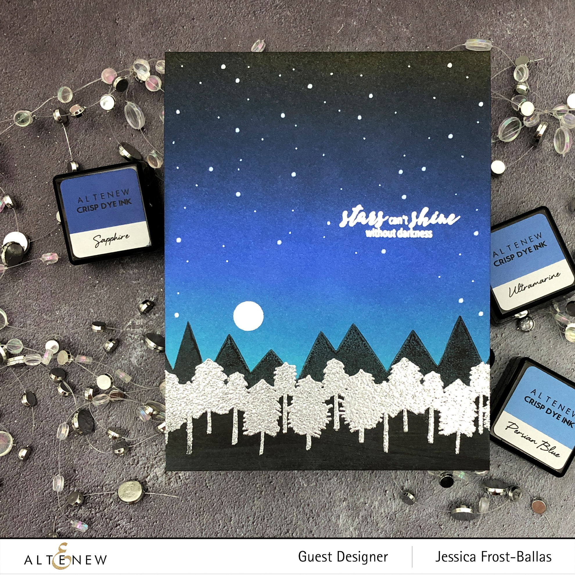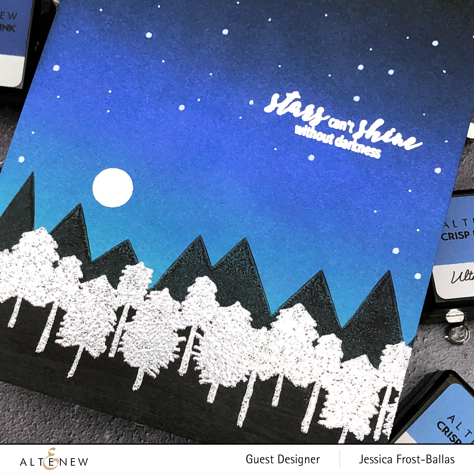 To start I blended Parisian Blue, Ultramarine, Sapphire, and Jet Black ink onto a panel of white cardstock. I let it dry and then stamped the sentiment and moon from Wanderlust with versamark and heat-embossed it with white embossing powder. Then I added stars with a white gel pen and a posca paint pen.