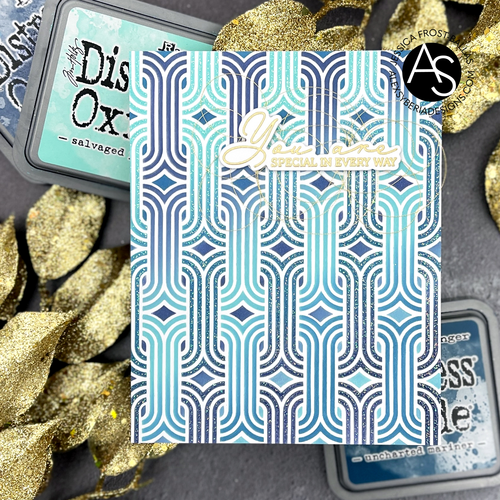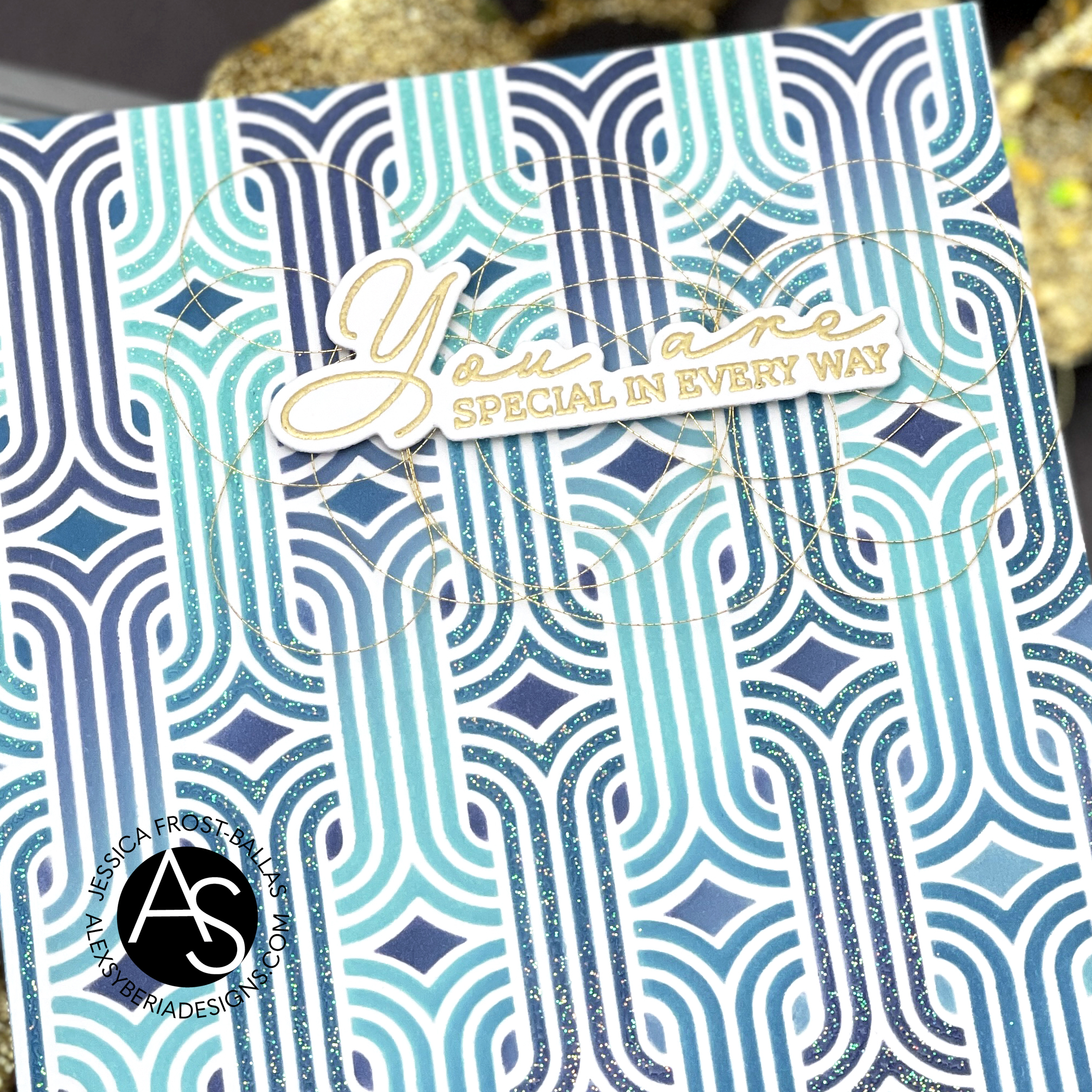 I blended the stencil layers with salvaged patina, uncharted mariner, and chipped sapphire distress oxide inks in alternating directions. Once the inks were totally dry I added a layer of sparkle glitter paste to one of the layers for a little extra shimmer (of course)! Then I finished the card with a sentiment from another set in the release adhered over a tangle of gold metallic thread.