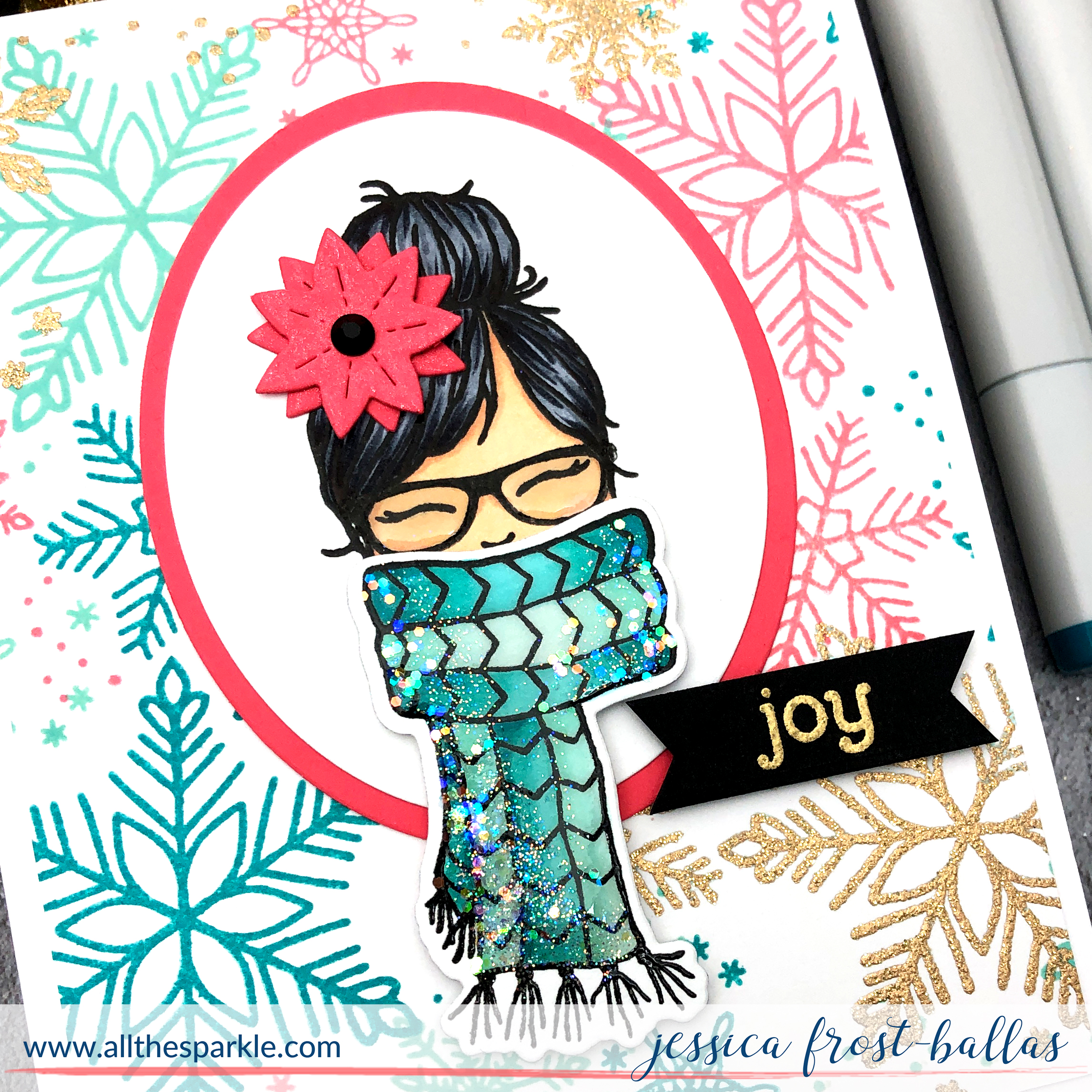 Next I stamped the Snowflake Turnabout with pink and teal inks with one turn heat-embossed with gold tinsel embossing powder. I also stamped a sentiment onto black cardstock with versamark and heat-embossed it with gold embossing powder. I trimmed the snowflake panel down and adhered it to a white card base. Then I adhered the oval frames with regular ATG adhesive and used foam mounting tape for the scarf. I finished the card with a little spectrum noir clear sparkle, nuvo crystal glaze, and a sprinkling of chunky and prisma glitter! This release is filled with a bunch of fantastic products but this set is a must-have! 😉