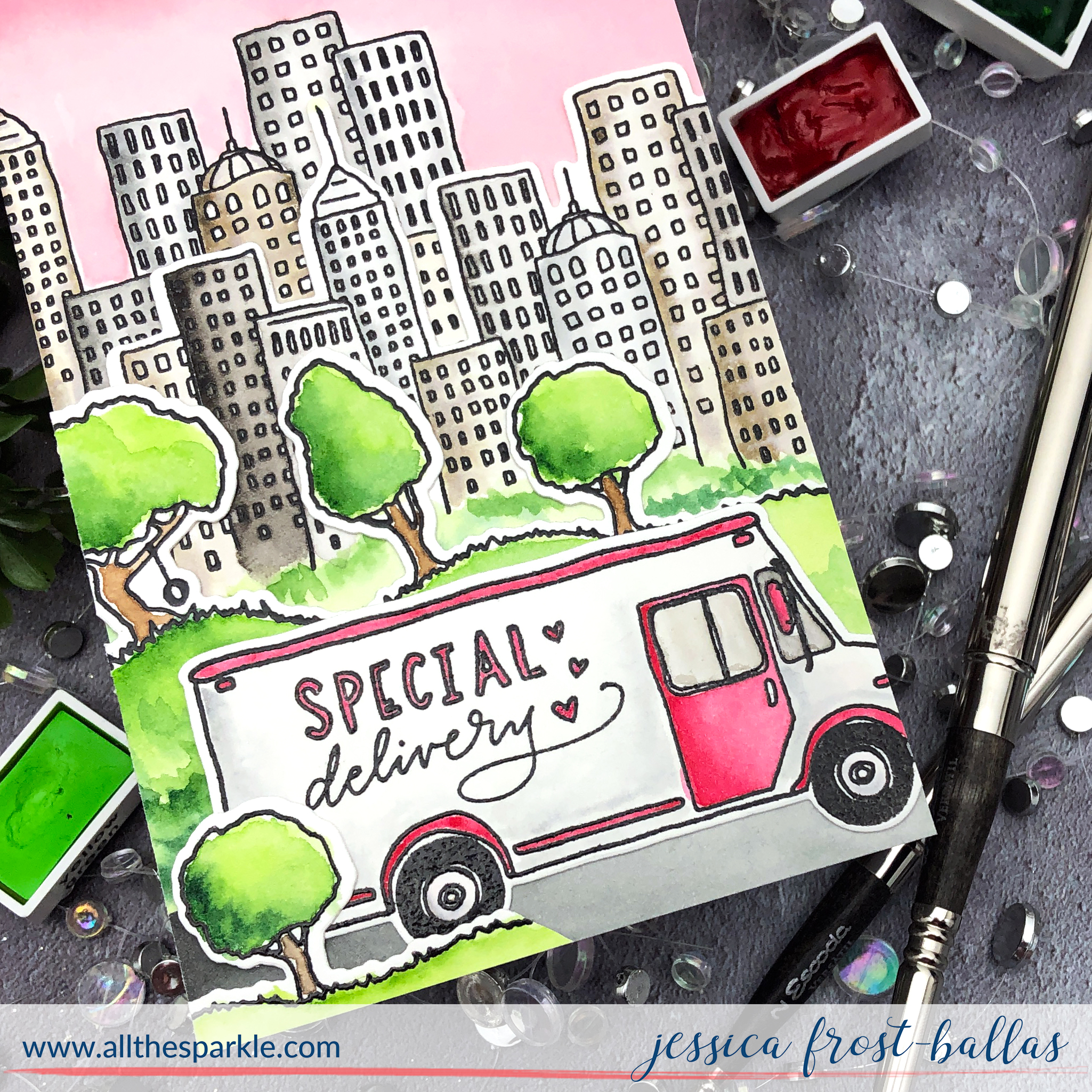 I started by stamping the truck, trees twice, and buildings onto a scrap of watercolor paper with versafine and heat-embossed them with clear embossing powder. Then I took a panel of watercolor paper trimmed down to 4.25″ by 8.5″ and stamped the buildlings again along with the sentiment. I taped the panels down to a hard board and watercolored them with a mix of Daniel Smith watercolors and distress inks. I used traditional watercolors on all of the stamped images and distress inks in spun sugar, worn lipstick, abandoned coral, and picked raspberry for the sky. I let them dry and then die-cut them with the coordinating dies.