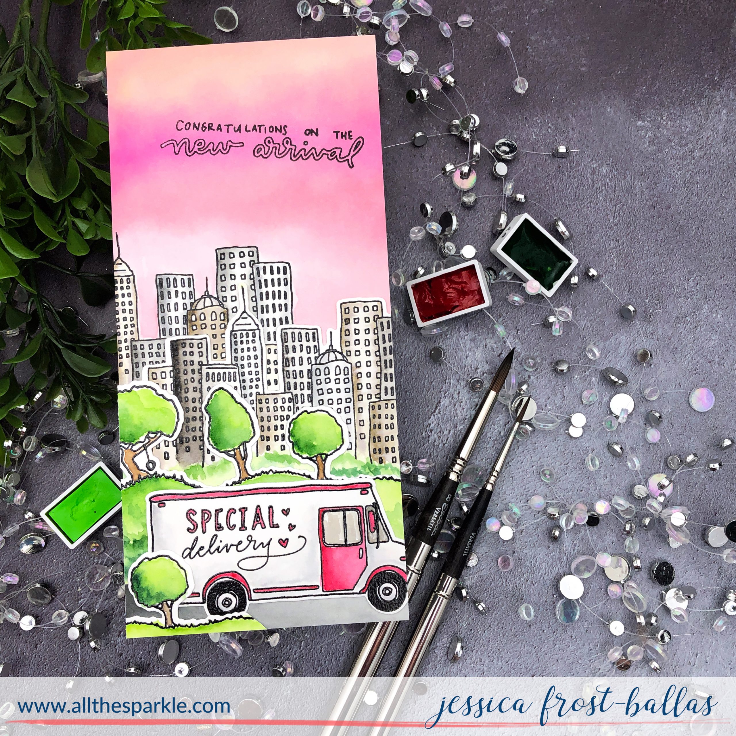 Once the panel was dry I trimmed it down to 3.75″ by 8″. Next I started building my scene! First I adhered my second set of buildings at an offset to create more dimension. I watercolored the space below the buildings with shades of green to create greenery in the distance. Then I watercolored more greenery below the trees and added a road with black soot distress ink. I adhered that to the panel and then added my delivery truck! Finally I trimmed down one of the trees and added it to the foreground. I trimmed off all the overhang and then finished the card with a little spectrum noir clear sparkle and crystal glaze!