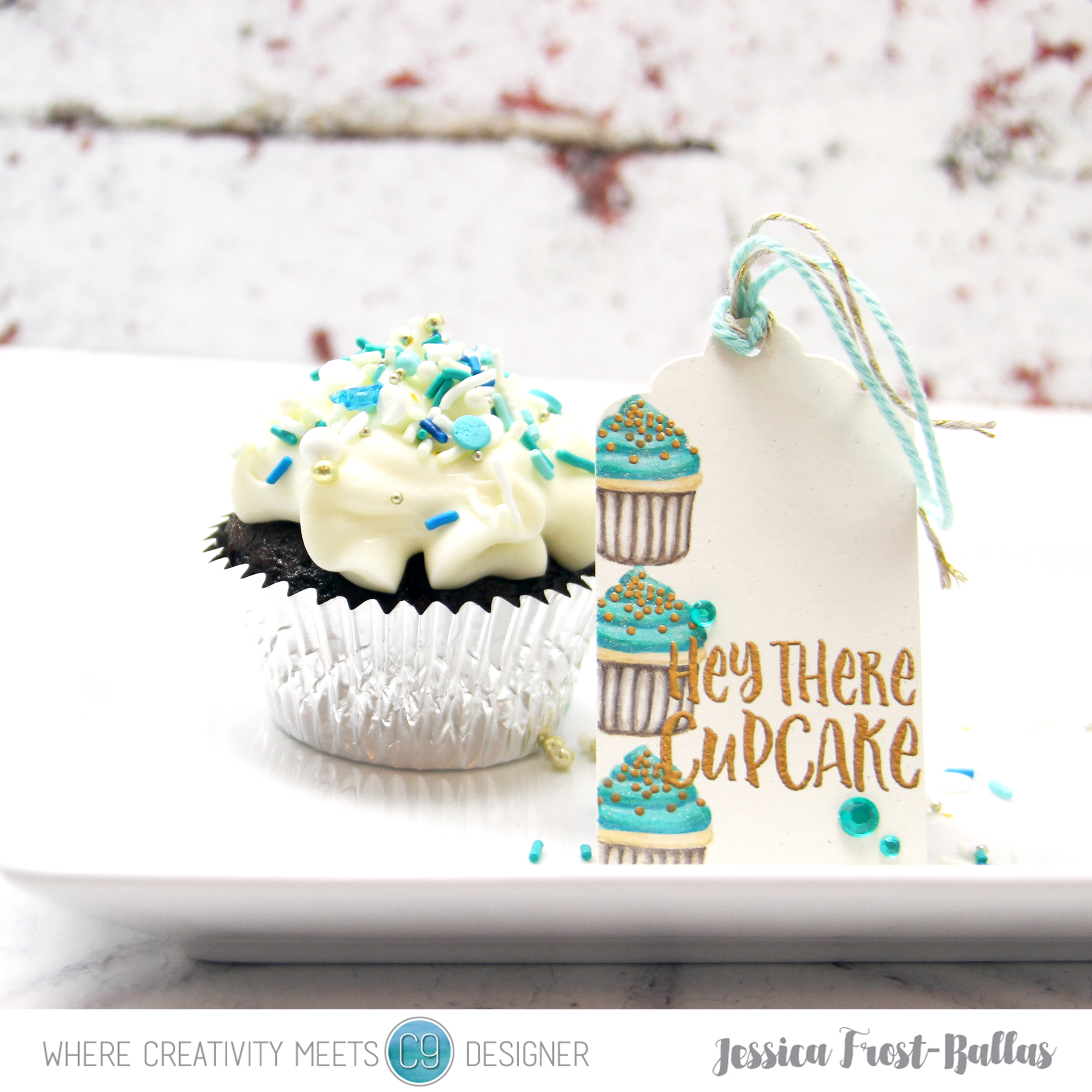 This set is fabulous to begin with but anything that requires cupcakes for photo styling is absolutely amazing in my book! 😉 To create my tags I started by die-cutting the tag die with off-white natural cardstock. Then I stamped the cupcakes with a pale beige ink. I used my prismacolor colored pencils and a blender pencil to color the cupcakes as vanilla cake with teal frosting (similar to the color of the C&9 logo!!). I added spectrum noir clear sparkle to the frosting and then I stamped the sprinkles and sentiment with versamark and heat-embossed them with gold embossing powder. I added a metallic and teal twine and a few teal gemstones to finish the tag!