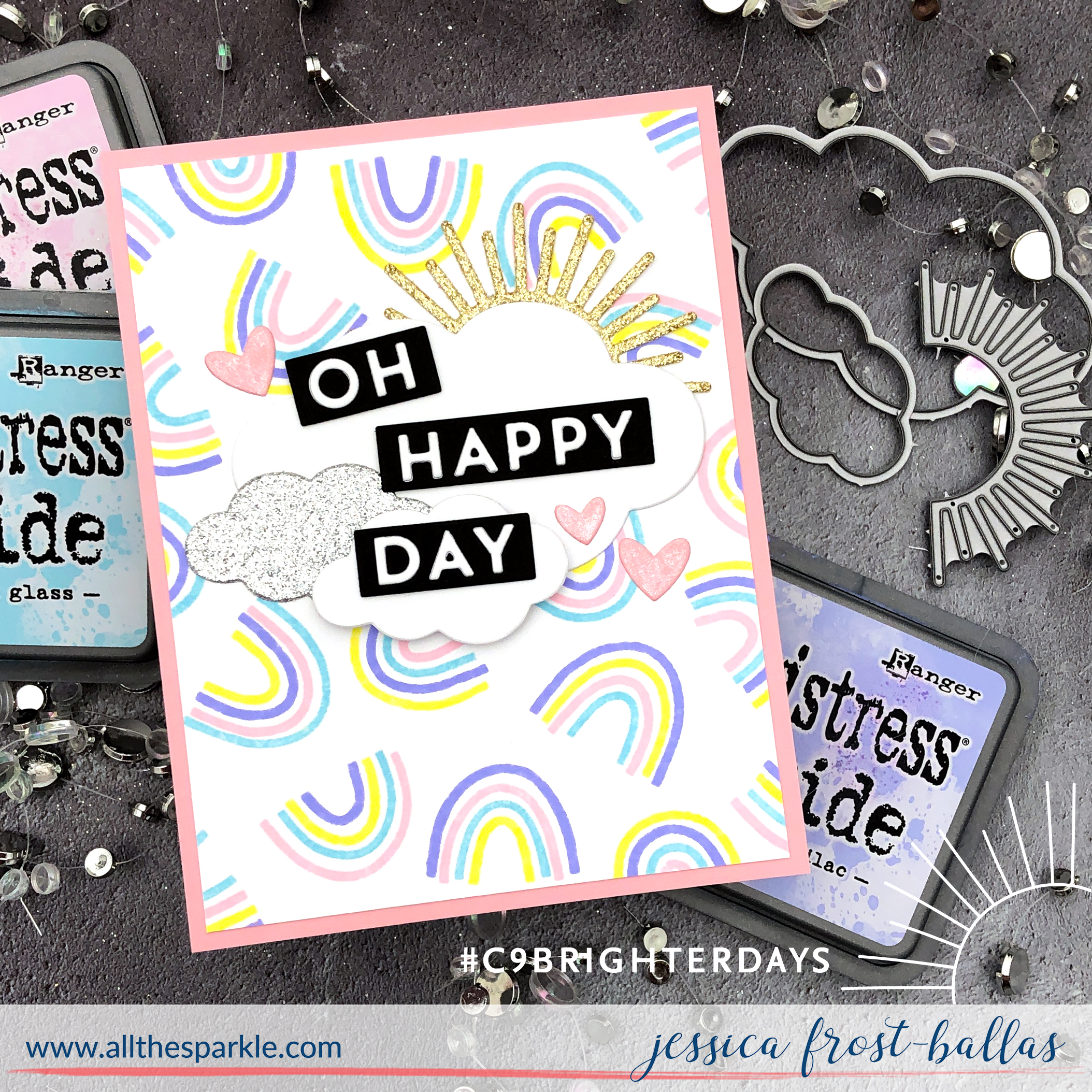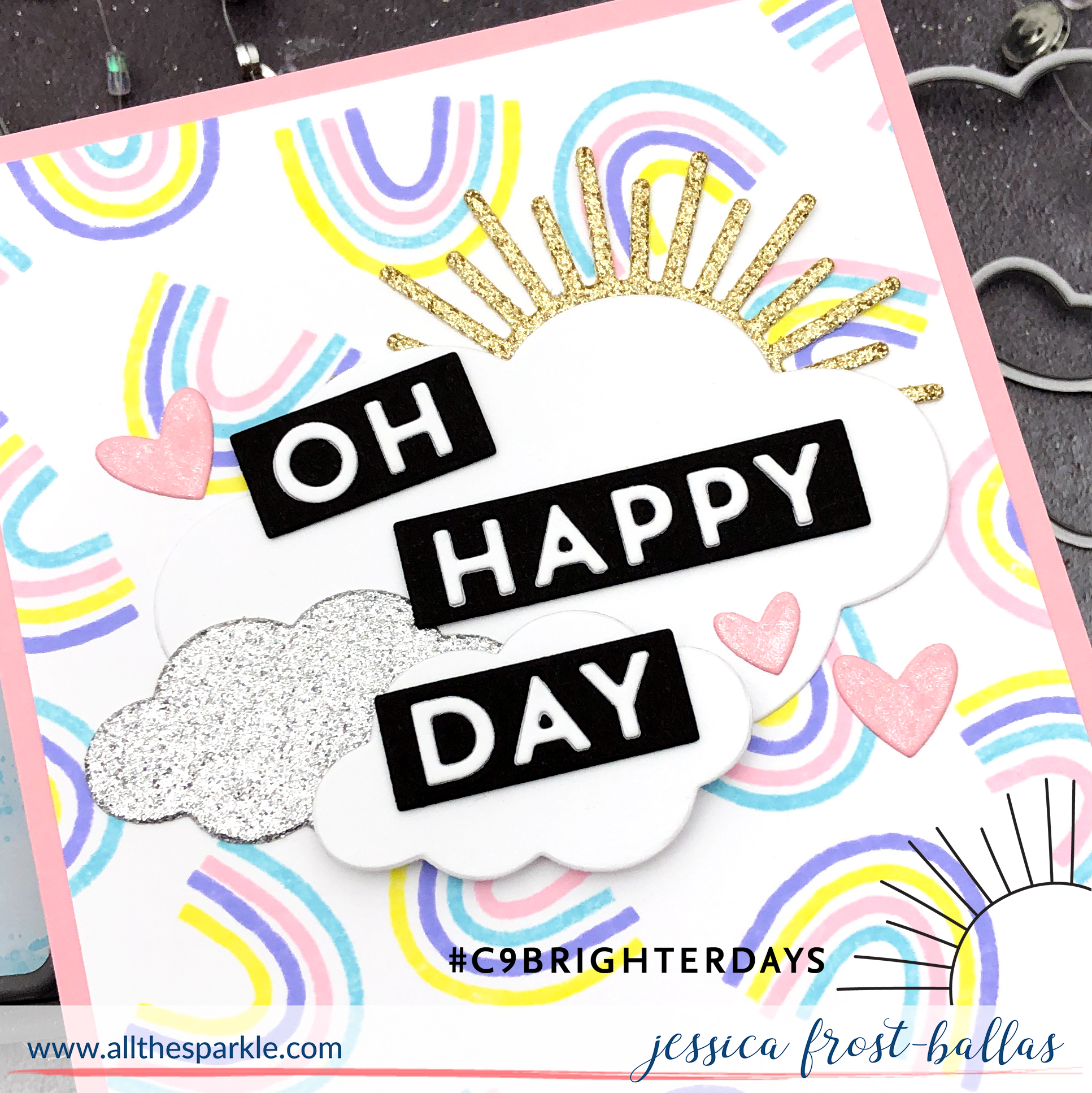 Next I die-cut the clouds from the Brighter Days die set with white and silver glitter cardstock, the sun from gold glitter cardstock, hearts from soft pink cardstock, and the sentiment from white and black cardstock. I puzzle pieced the sentiments together with white and black cardstock and added a scrap of black cardstock behind each label to keep everything in place. Then I arranged all the elements on my rainbow panel and adhered them with a mix of regular adhesive and foam mounting tape. I finished the card by adding a little spectrum noir clear sparkle to the hearts!