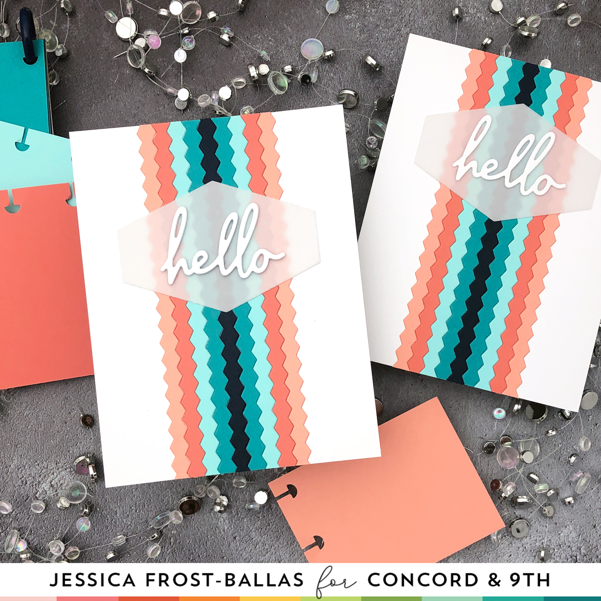 If you’ve seen photos of my craft room you know that these shades of coral, teal, and navy are kinda my thing…ha, they’re also my blog colors! 😉 Anyway, these are super simple and quick cards to create but I love how they turned out! I die-cut the rick rack shape using a die from the Hexagon set. I’m using Sorbet, Grapefruit, Aqua Sky, Oceanside, and Midnight for my design!