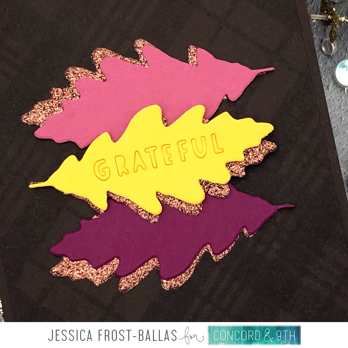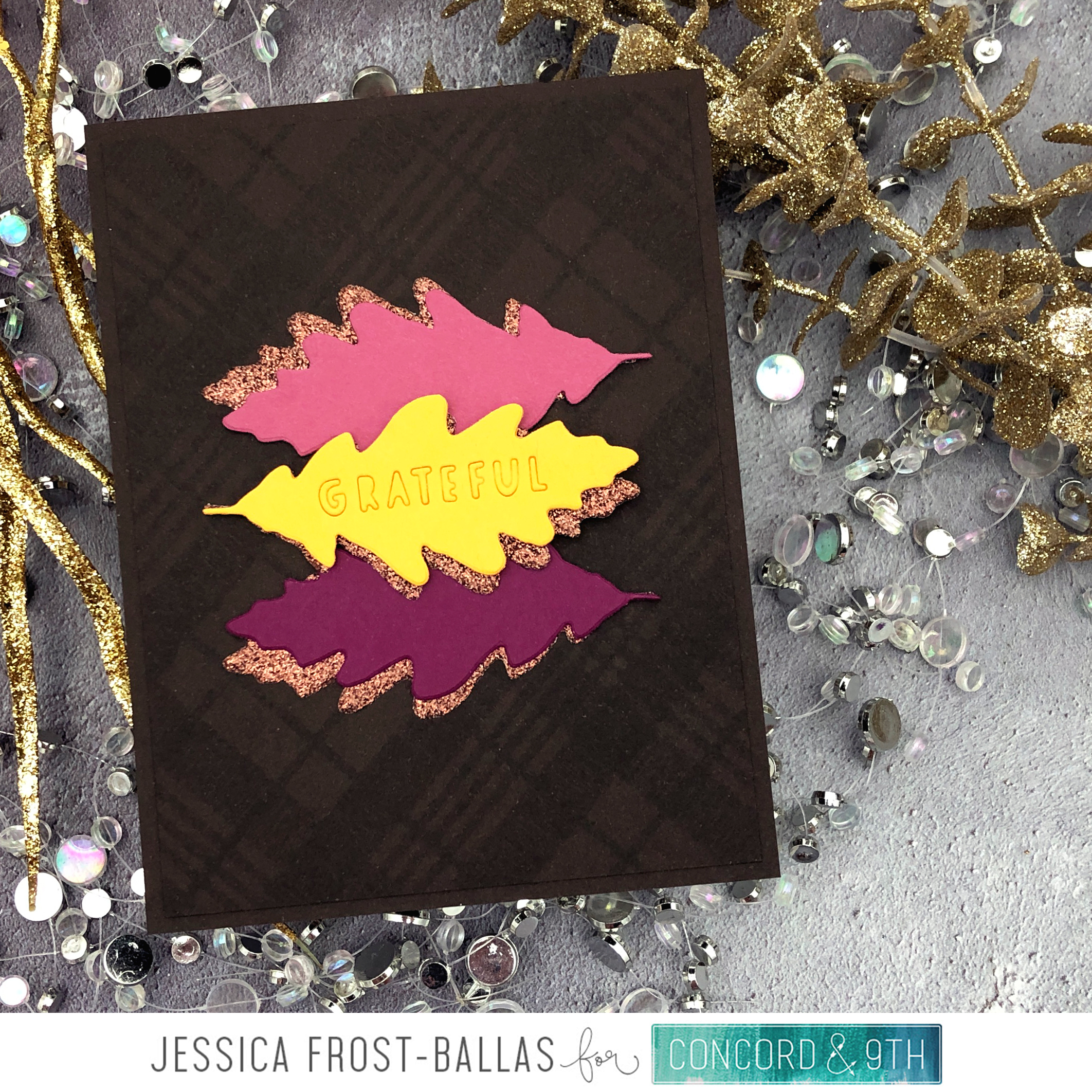 My second card uses the Autumn Harvest bundle as well as the pretty Woven Plaid background! I started by stamping the plaid background onto dark chocolate cardstock with dark chocolate ink for a tone on tone background. I trimmed it down to 4″ by 5.25″ and adhered it to a dark chocolate cardstock base. I decided on a slightly less conventional fall color palette and die-cut rose pink, warm yellow, and eggplant purple leaves from the Autumn Harvest die set. I also die-cut the grateful word from the yellow leaf and placed a piece of clear tape behind the die to keep the letters in place. I also die-cut three leaves from a brown glitter cardstock and adhered them at an off set behind the cardstock leaves. I adhered the pink and purple leaves to the background panel and then popped up the yellow leaf with foam mounting tape to finish the card! I really love how this turned out and look forward to experimenting with more unusual fall color palettes! 😉