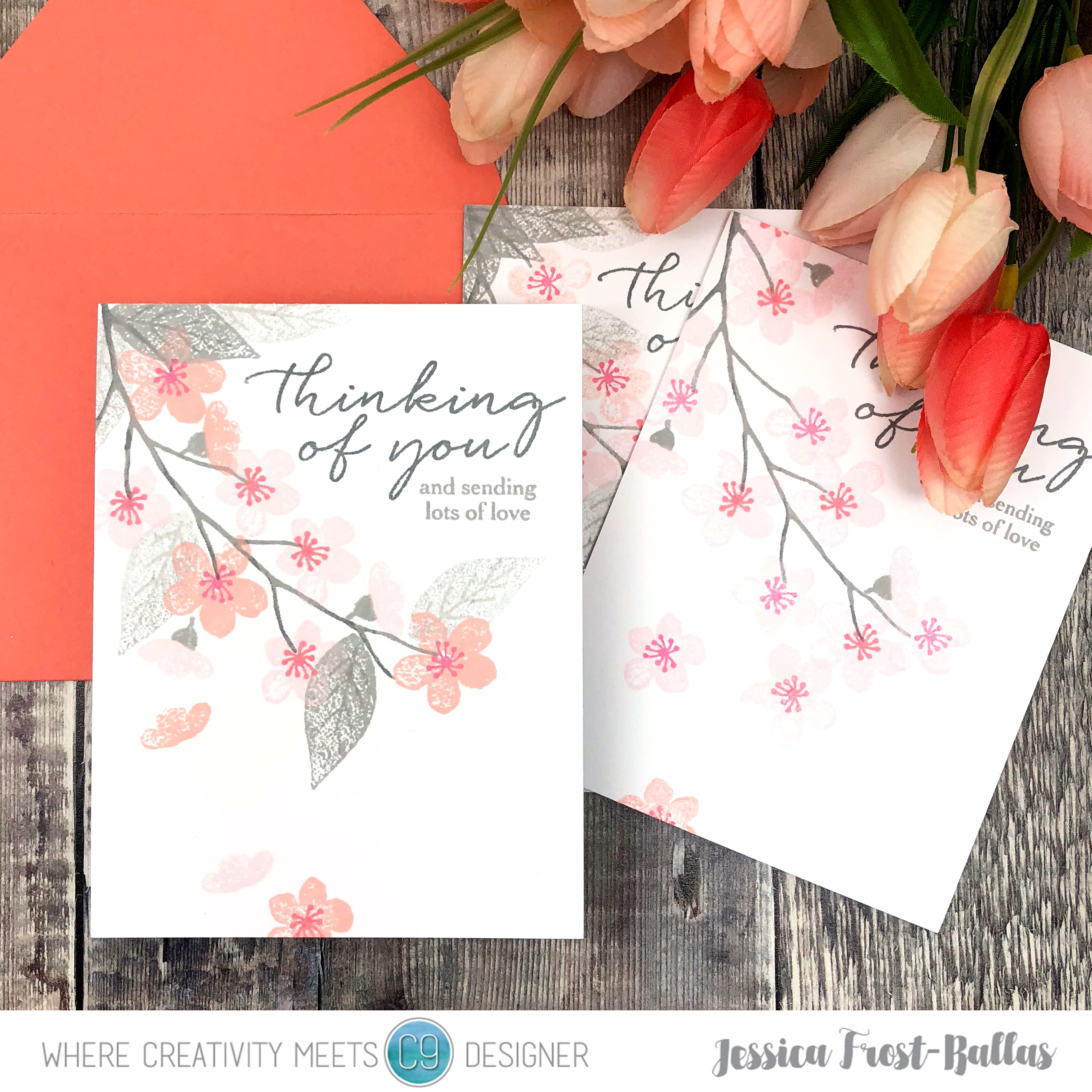 I used a different combination of inks and petals and second generation stamping for each one but predominantly I used Silver Stone, Industrial Diamond, Pink Pearl, Coral Berry, Coral Bliss, and Frosty Pink inks from Altenew for my cards. I love how you can build your branches any way you’d like by changing which stamps you use! I actually made a second set of sympathy cards using just the leaves in shades of grey.