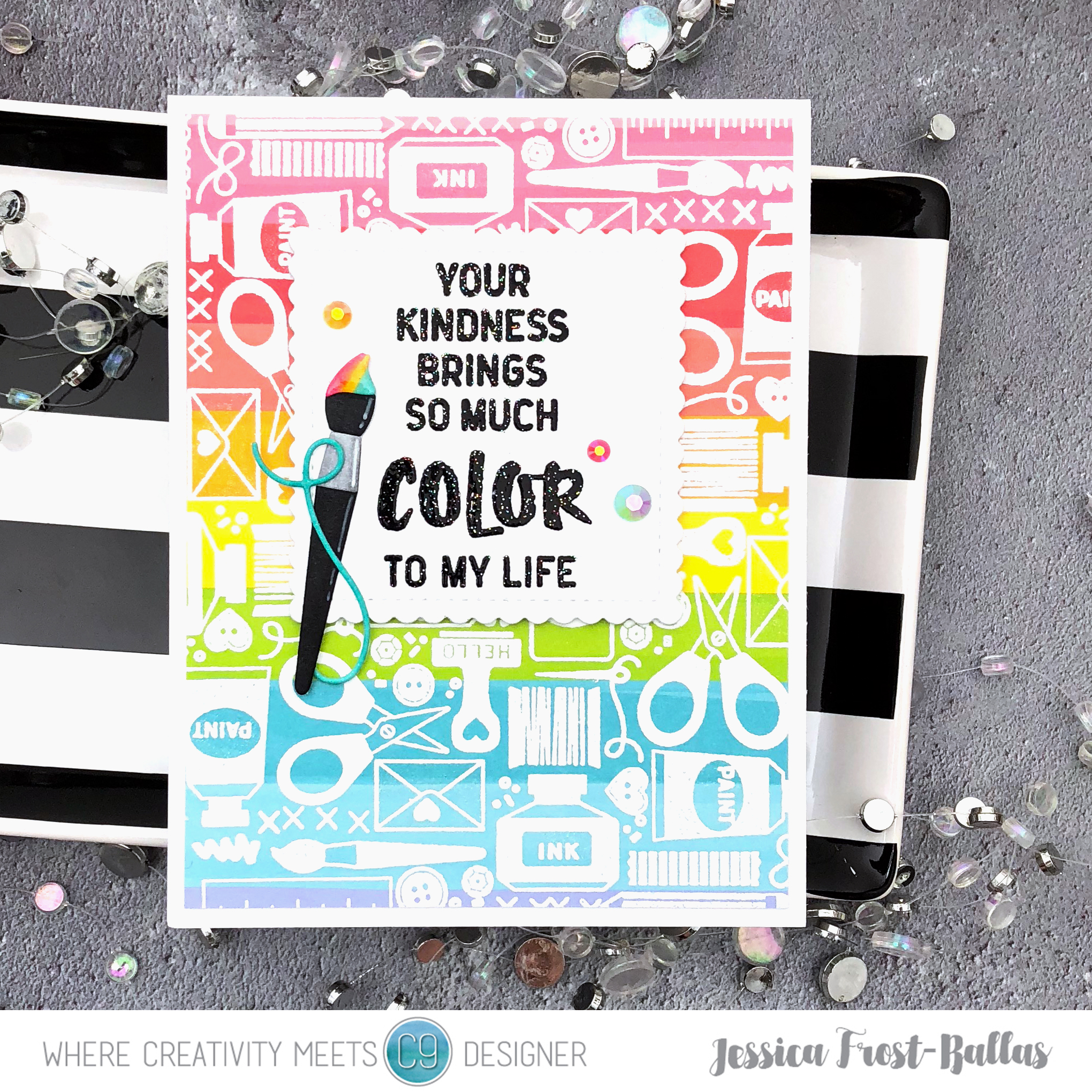 Next I die-cut a scalloped square frame and stamped the sentiment with versafine before heat-embossing it with black sparkle embossing powder. I adhered it to the card with foam mounting tape. Next I die-cut the string and paintbrush from Crafty dies and colored them with copics. I added a few accents with a white gel pen, spectrum noir clear sparkle, and nuvo glaze and then adhered them to the sentiment frame. Finally I added a few jewels to finish the card!