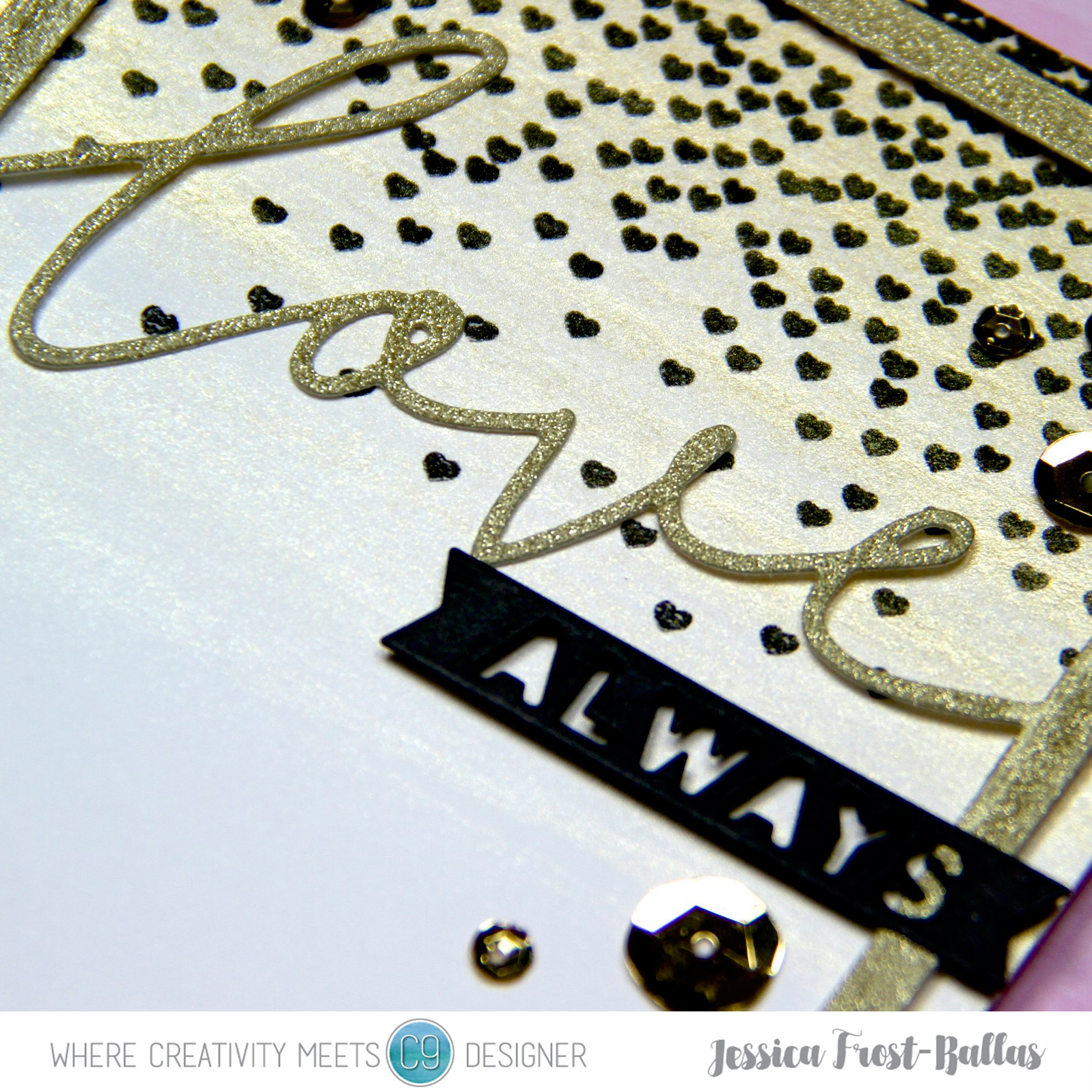 Next I die-cut the sentiment banner from Love Always Frame dies with black cardstock and adhered it to the gold frame. Then I adhered the frame to the background with foam mounting tape. And finally I added a little extra sparkle with a sprinkling of metallic gold sequins!