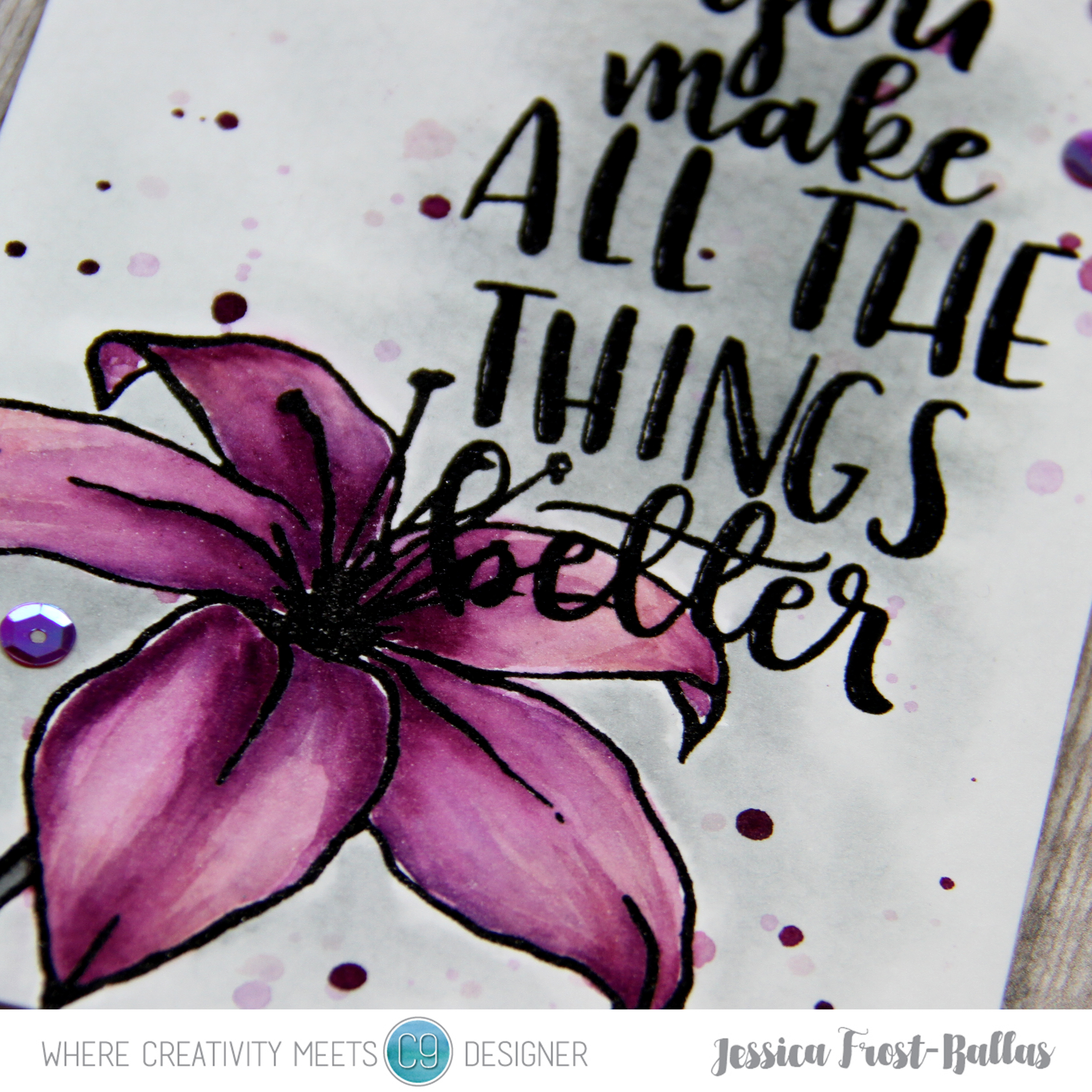Next I smooshed Black Soot distress ink onto my craft mat and then watered it down before doing a wash across the background of my card. I concentrated the color around the flower and the sentiment and then faded it out to the edges. I let it dry slightly until it was just slightly damp and then covered the lily with a mask. I flicked distress inks onto the background and then blotted it. I repeated the process two more times and waited longer each time before blotting for darker spots. Finally I flicked Dusty Concord distress ink onto the background and didn’t blot it at all. Once everything was dry I adhered it to a card base and added a sprinkling of purple ombre sequins!