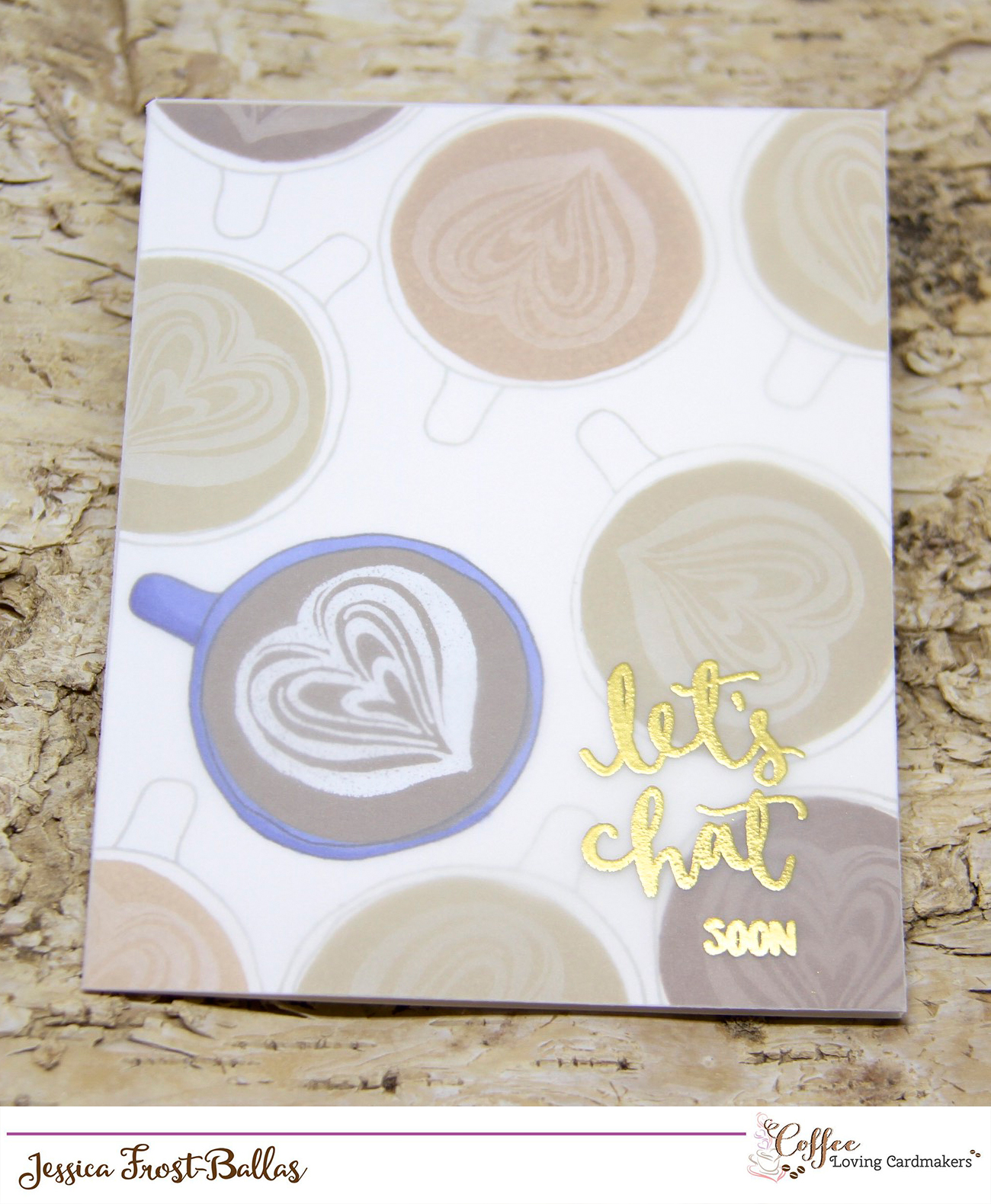 I started off by stamping the cup outline onto a piece of white cardstock. I stamped one in black ink and the rest in a light grey ink. I colored the black cup with copic markers but left the others alone. Then I used various shades of brown ink to stamp the contents of the cups. I stamped the heart latte art with white pigment ink in the white cups and then heat-embossed it with white embossing powder in the blue cup so that it would stand out a little more. Next I stamped the sentiment onto a piece of vellum cut slightly larger than an A2 card base and heat-embossed it with gold powder. I scored the vellum to an A2 size and then folded the edges over the background panel and adhered them to the back of the panel so there would be no need for glue or adhesive on the front of the card! Finally I adhered it to a white card base and that was it! I really liked how this card turned out so I created several more but used a different colored cup for each one!