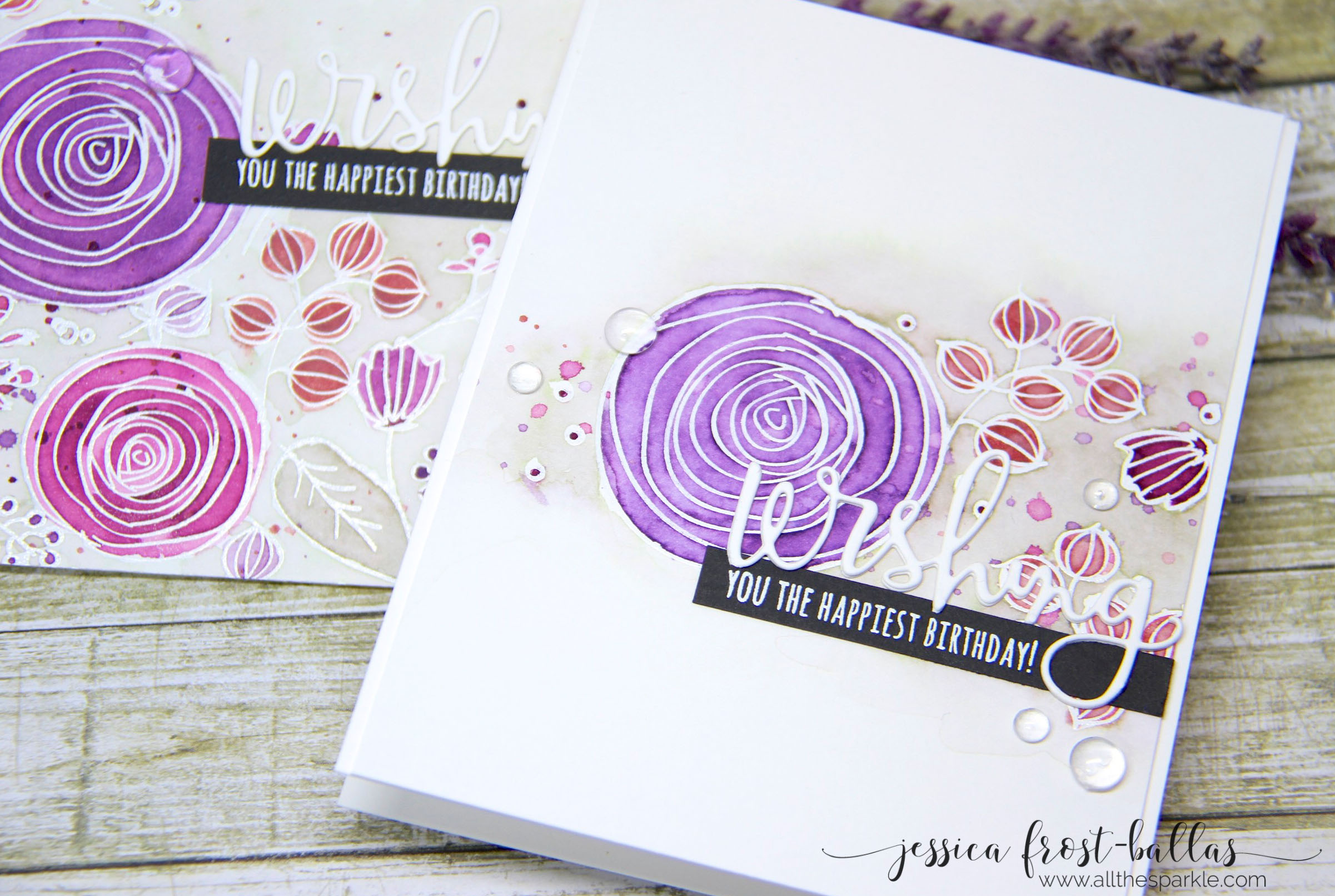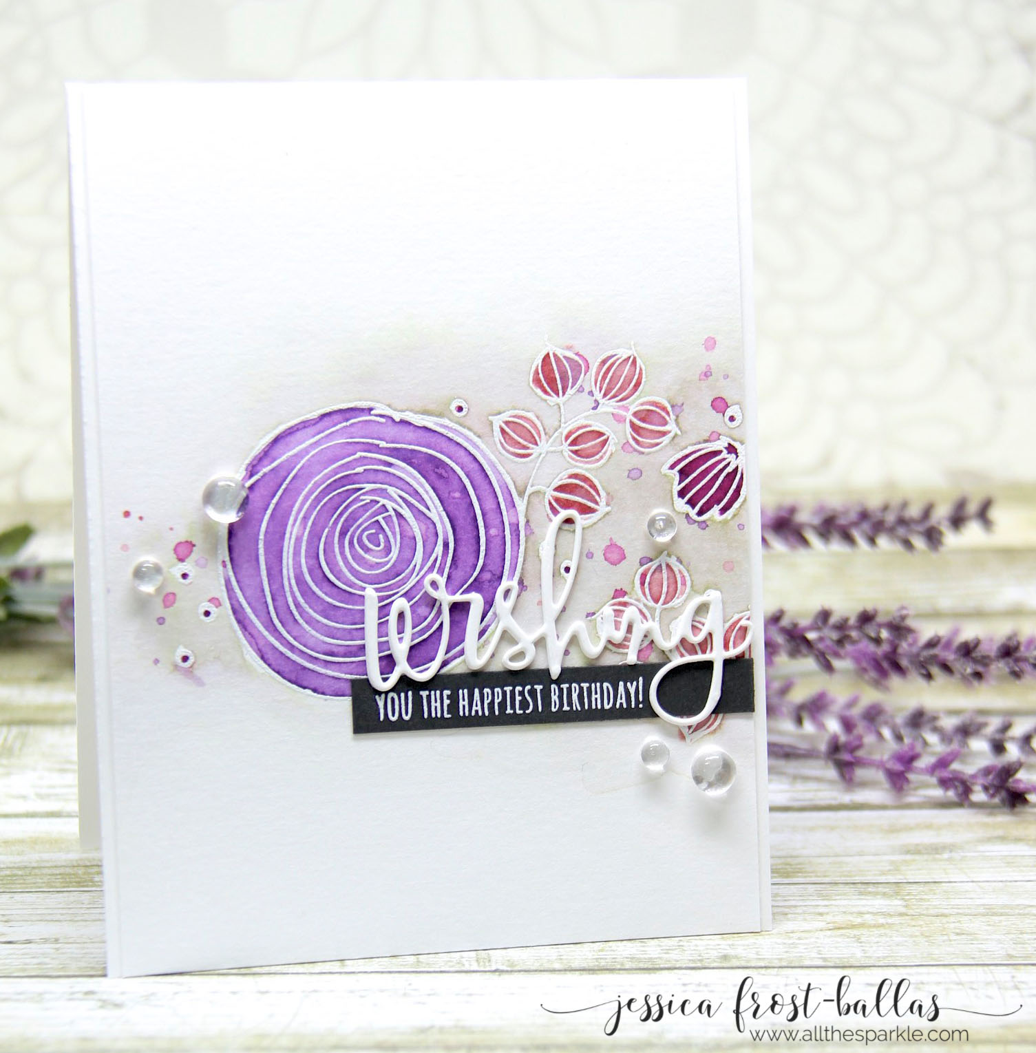 I started by prepping a piece of watercolor paper with my powder tool and then I stamped a few of the flowers from the Sketch Ranunculus set with versamark and heat-embossed them with white embossing powder. Next I wet the flowers and then dropped in seedless preserves, victorian velvet, and dusty concord distress ink. I did a very light layer, let it dry, and then went back in with a second layer to darken parts of the flowers. Once that was dry I wet the area around the flowers and painted it with pumice stone distress ink. I used a lot of water to blend out the edges and provide that white space that a CAS card really needs! Once that was dry I placed a piece of scrap paper over the top and bottom halves of the card to block off the white space and then flicked victorian velvet and seedless preserves distress ink over the design.
