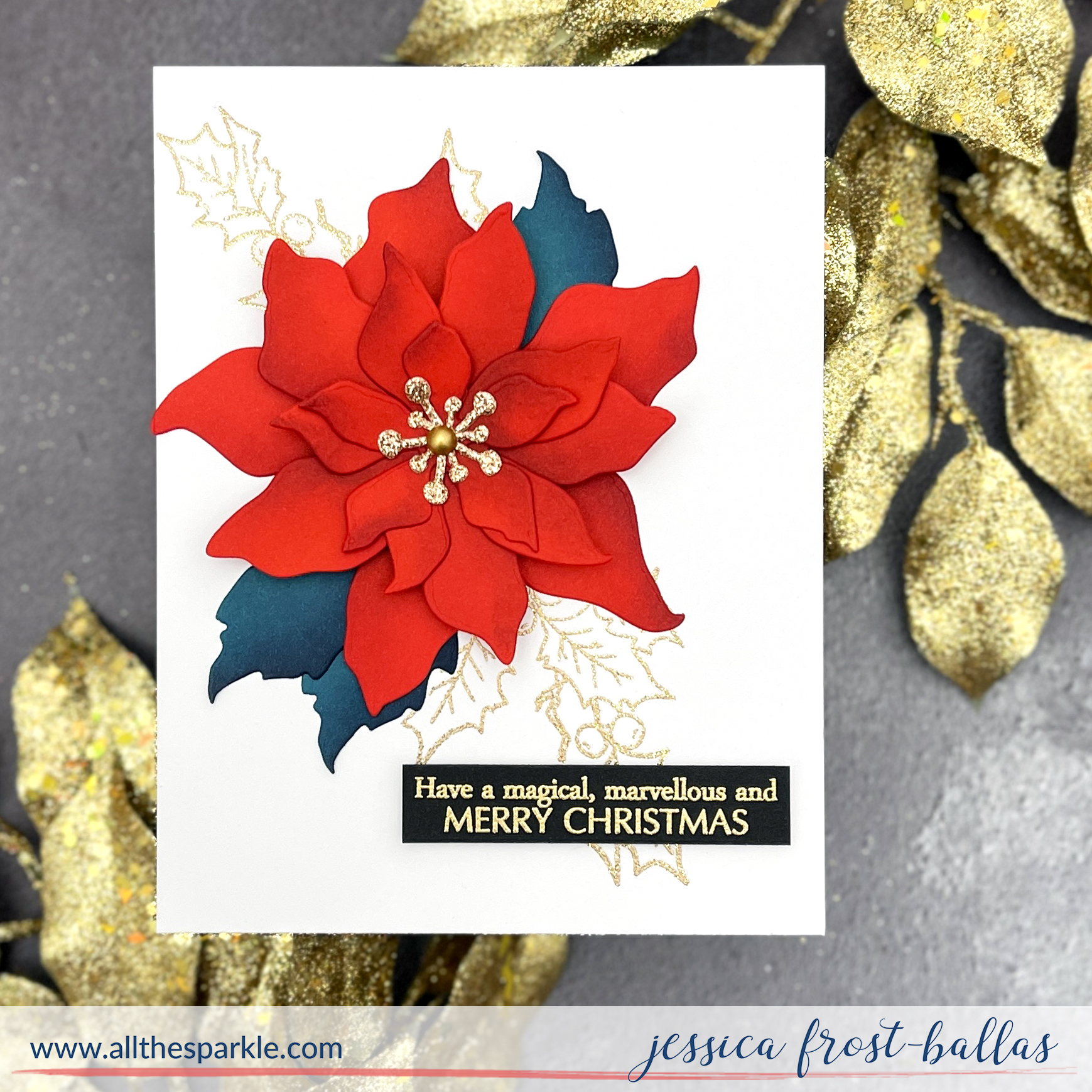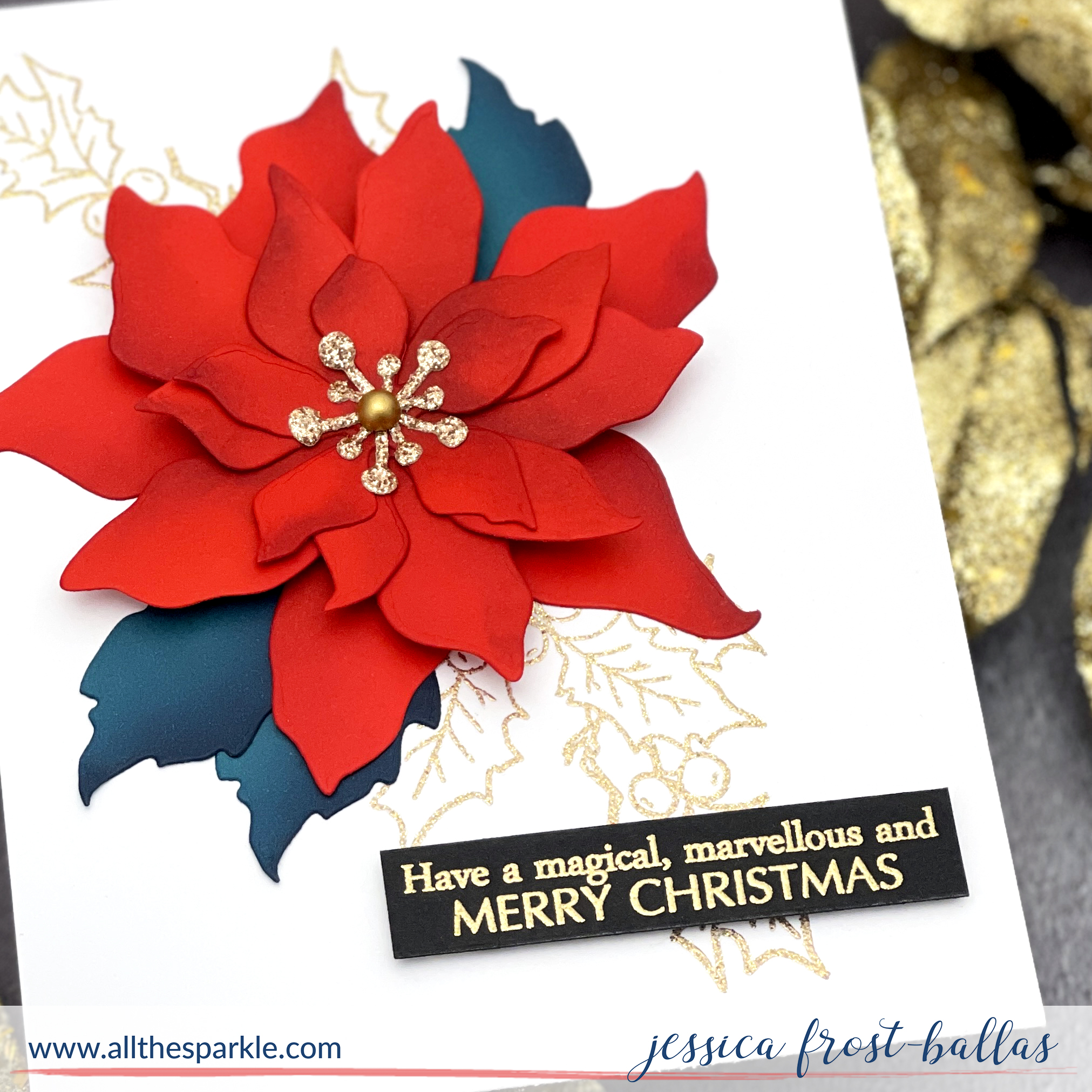 I decided to keep her floral theme but with a holiday twist! I’m a big fan of a black label sentiment so that was the one element of the card I kept pretty much exactly the same. I stamped a sentiment from Crafty Meraki’s Magical Christmas onto black cardstock and heat-embossed it with gold embossing powder. Next I stamped the holly from Christmas Miracle twice onto a panel of white cardstock and heat-embossed it with gold glitter embossing powder. I wanted to tie in to Michelle’s heat-embossed background but in a slightly different way!
