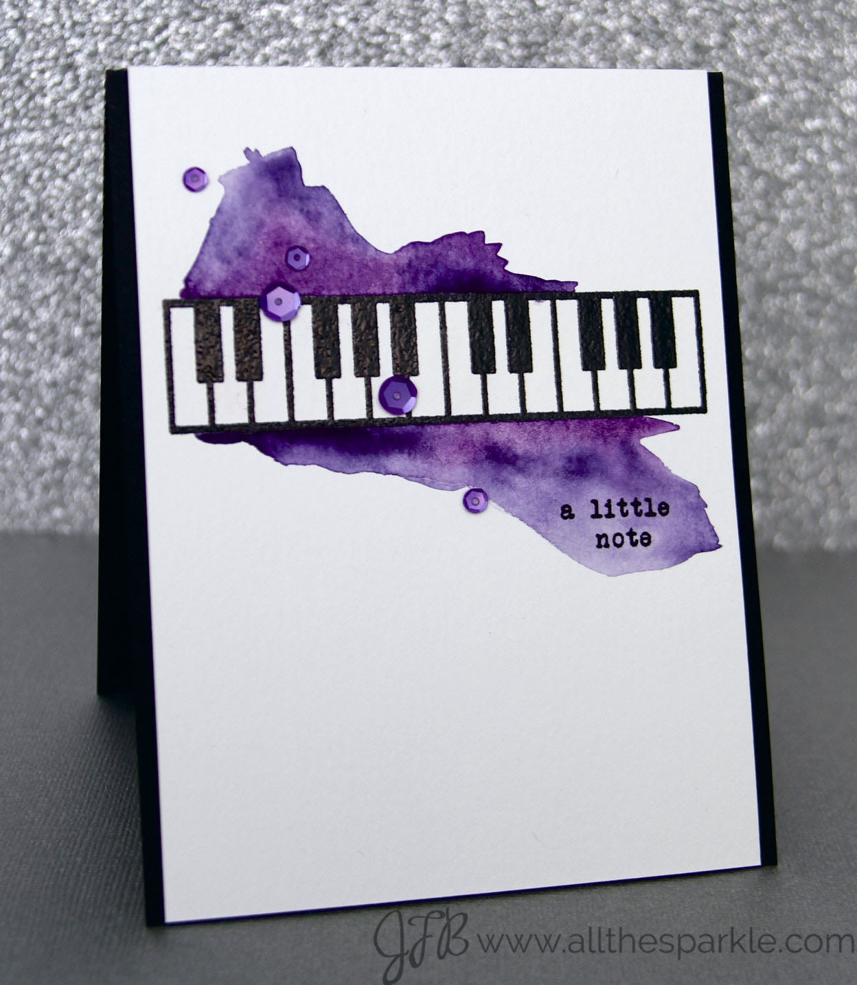 I had my Gansai Tambi watercolors out for another upcoming card and decided to use them for this piano card! I stamped the keyboard and sentiment in versafine and embossed it with clear embossing powder. Then I covered the keyboard with frisket masking fluid. Once the frisket had dried I watercolored the background with two different shades of purple. I let the paint dry naturally and then I rubbed off the frisket revealing the clean white keyboard underneath! To finish the card I added a sprinkling of sequins from The Ton! 🙂