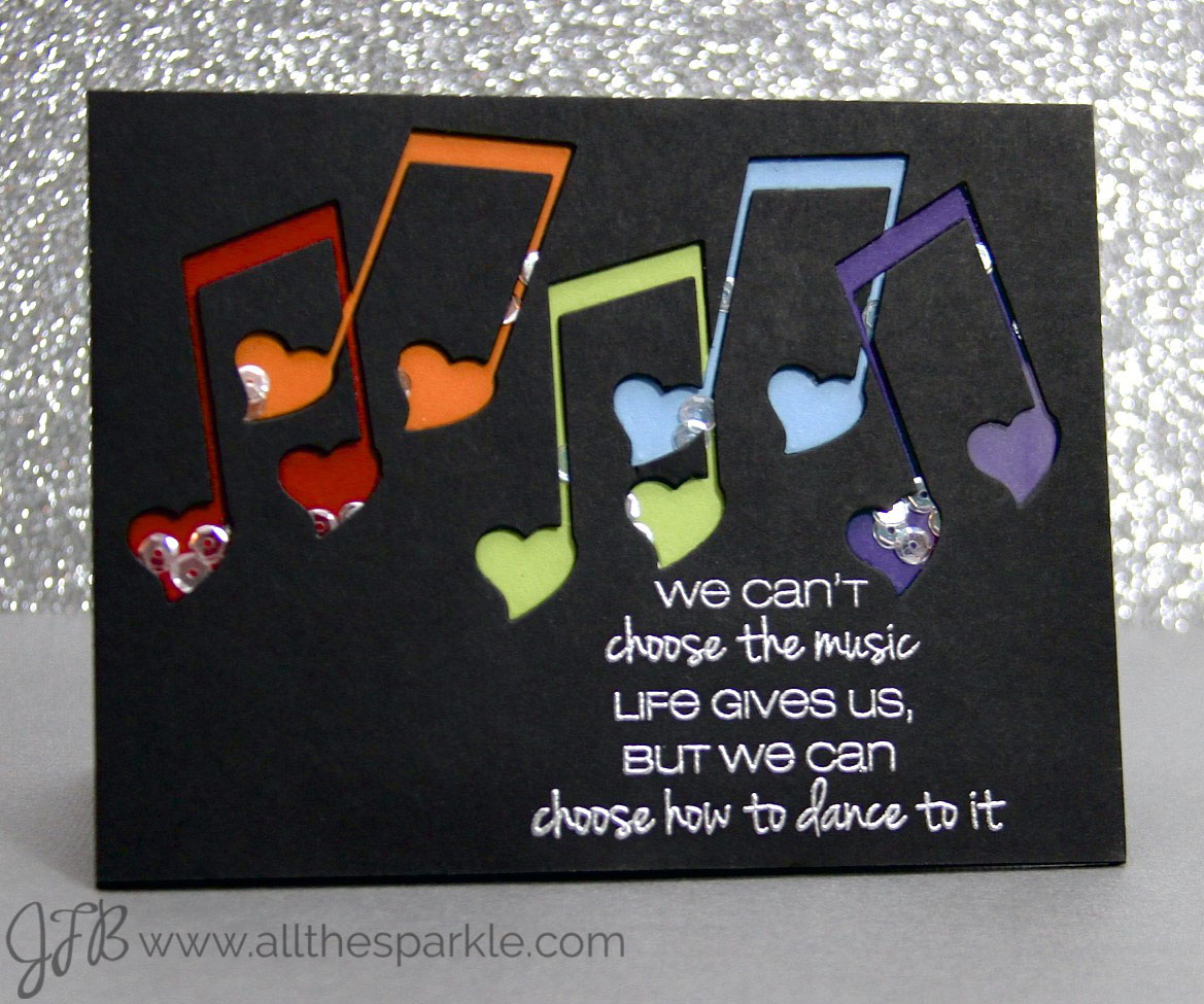 For this card I started off by die-cutting the Double Note Fri-dies from five different colored cardstocks in a rainbow pattern. Then I took a piece of black cardstock and cut the Double Note Fri-dies five times overlapping slightly. I took a second piece of black cardstock and laid the die-cut piece on top. Using that as a guide I inlaid the rainbow colored notes and adhered them to the full black panel. Next I stamped the sentiment from Big Treble with versamark and heat-embossed it with silver superfine embossing powder.